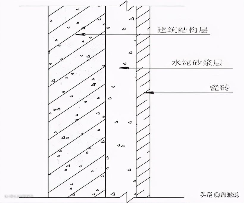 3、墙面基层先处理平整,粘贴层厚度控制在7-10mm为宜,采用专用瓷砖粘贴剂粘贴牢固 (单块空鼓小于 15%,且每自然间不超过总数的5%)。