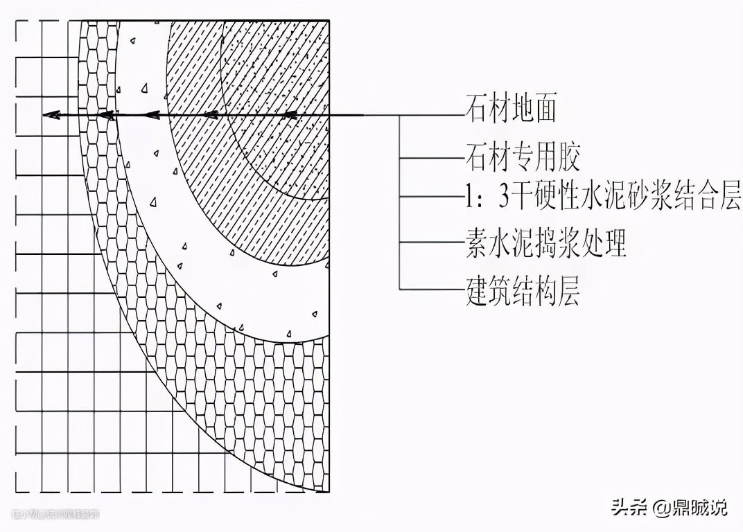 施工工序:地面清理→试拼→水泥浆结合层→铺贴石材 →养护→晶面处理