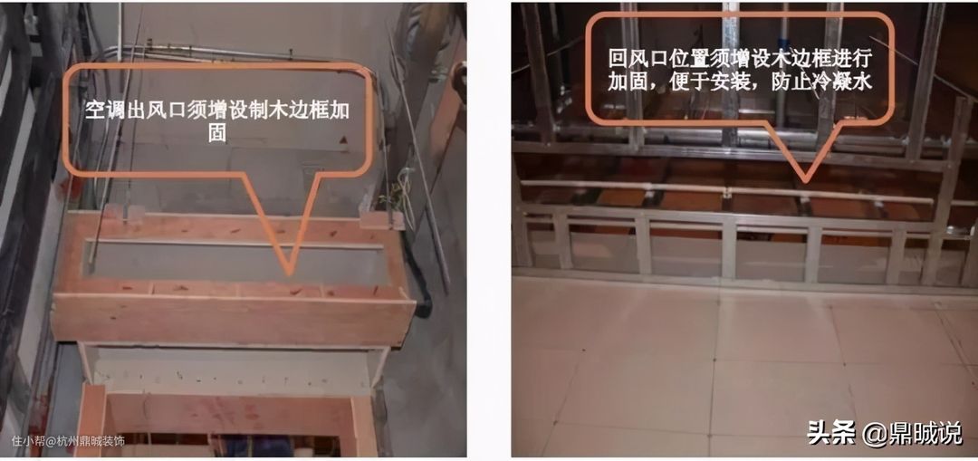1、空调回风口、出风口、换气扇等处要求设置木边框,便于风口及设施安装以及防止冷凝水。