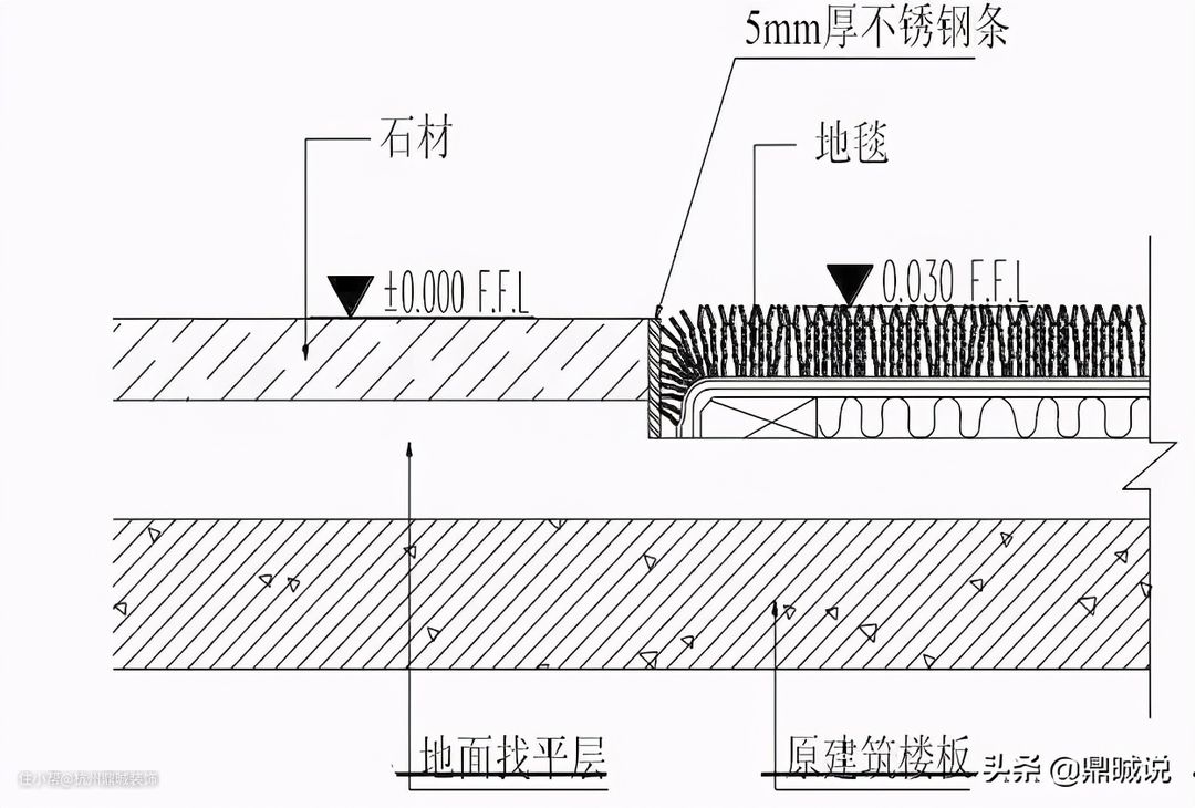 4、地毯与大理石不得直接拼接,可采用过渡材料进行拼接收口(如:不锈钢条、铜条等),收口处绒毛应高出5mm。