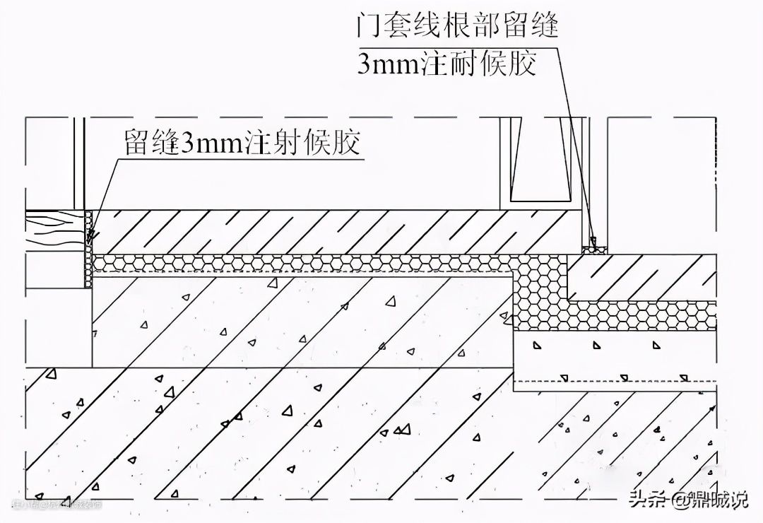 4、为避免门套受潮发霉,门套及门套线安装在门槛石上,门套根部留2~3mm缝采用耐候胶(颜色与门套线同色或按设计要求)封闭。