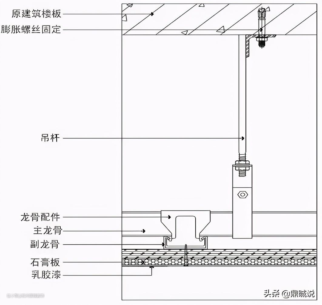 施工工序:弹出天花完成面线→吊杆安装→安装主龙骨→安装沿边龙骨→安装次龙骨→龙骨调平→进行隐蔽验收→安装石膏板