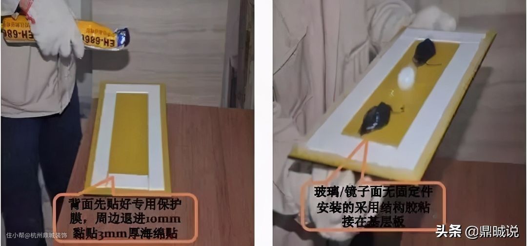 3、玻璃/镜子面无固定件安装的采用结构胶粘接在基层板上,胶干前下撑支架固定,胶干牢固后拆除支架。4、玻璃/镜子安装完成后进行保洁时严禁使用酸性洗涤剂或含研磨粉的去污粉清洗。