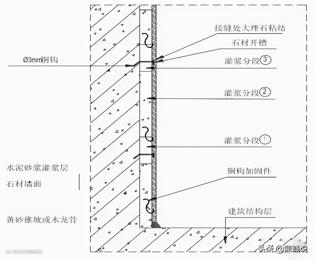 施工工序:石材排板放线→预排石材→板材固定→灌桨→嵌缝