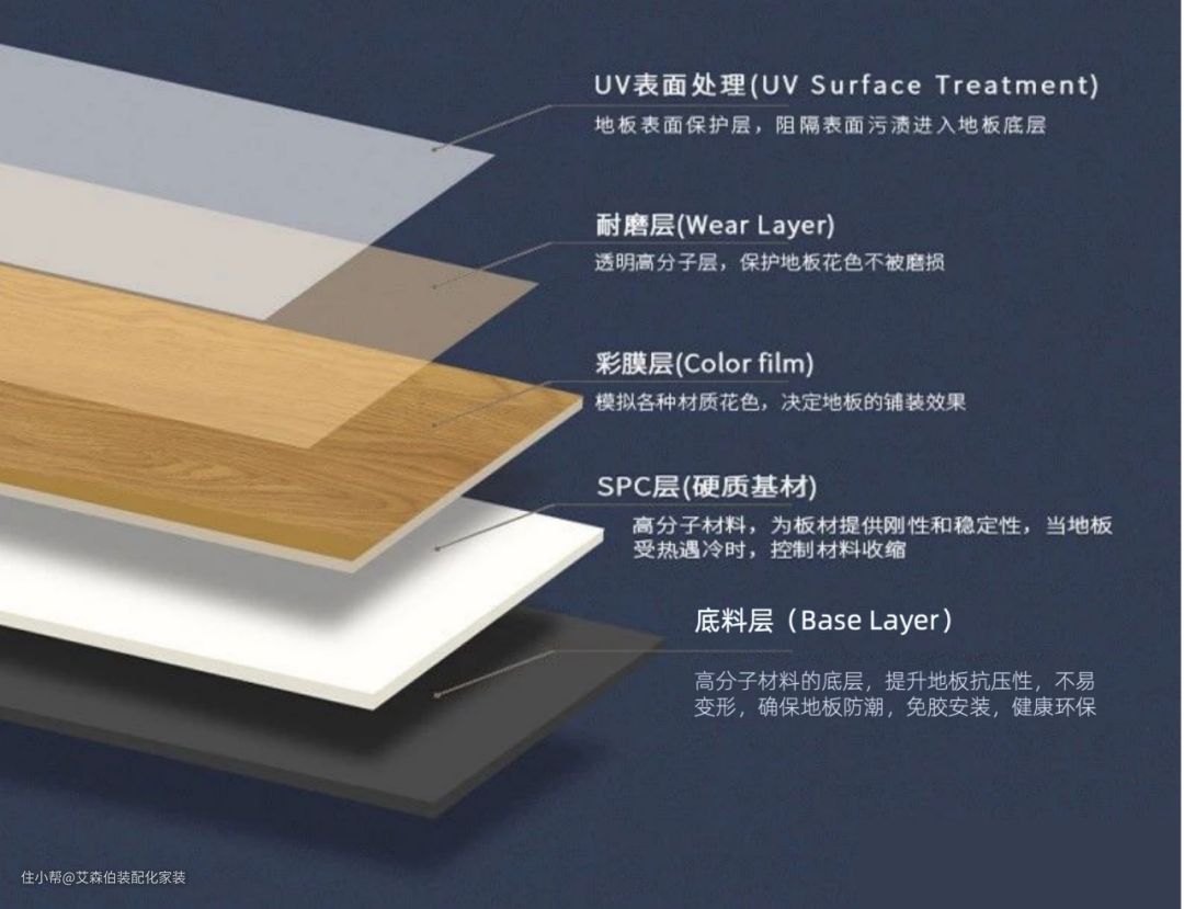 ● SPC地板主要由UV层、耐磨层、彩膜层、SPC高分子基材层、底料层构成。