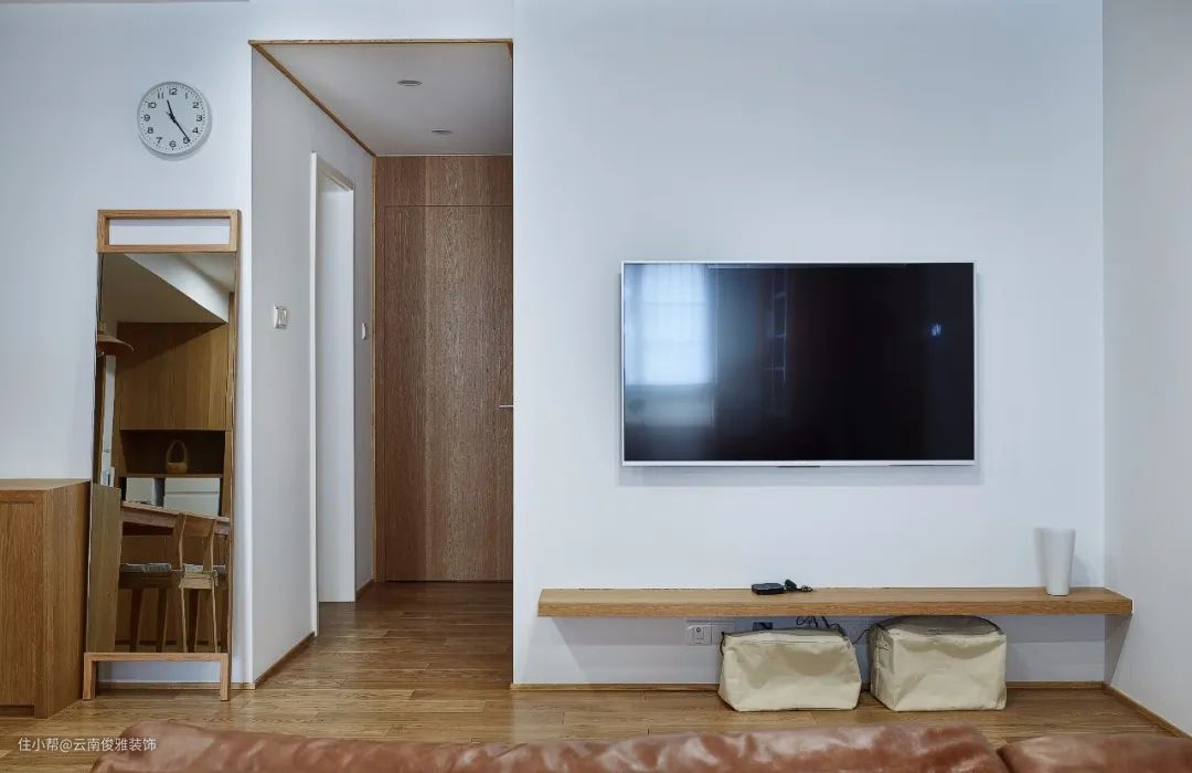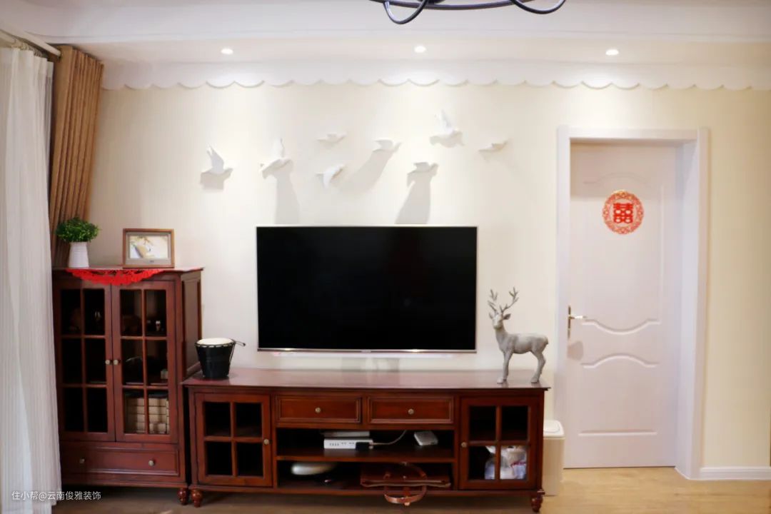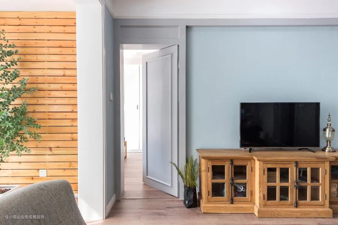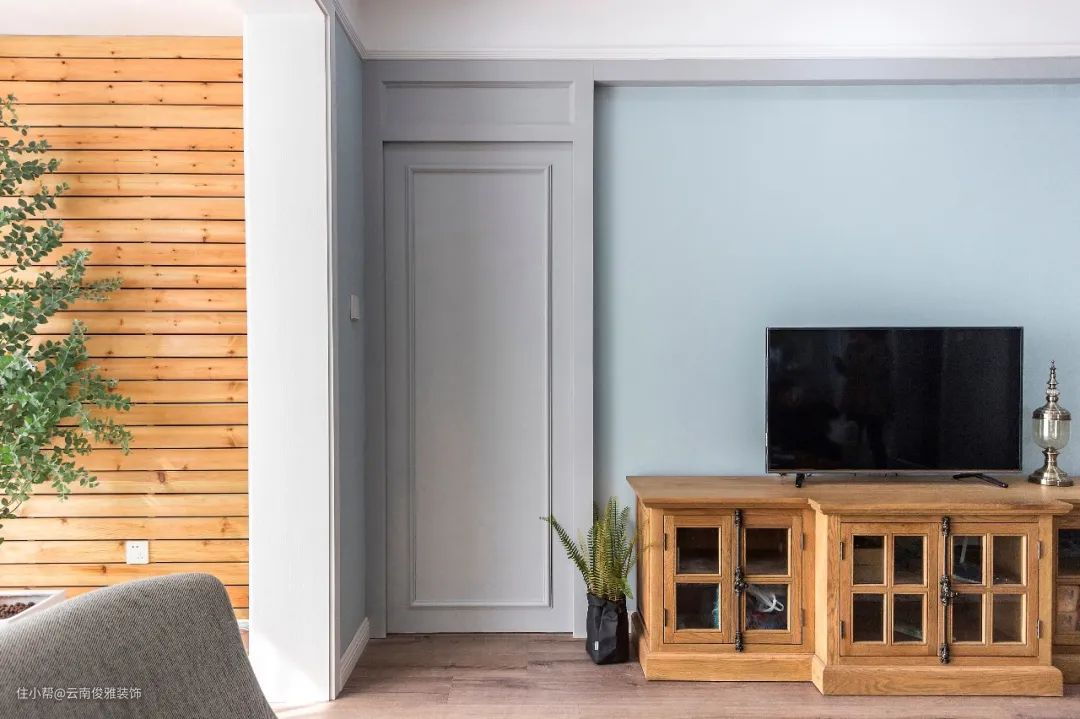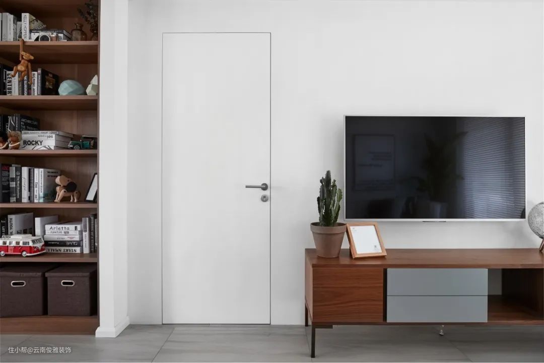 如果不喜欢边框造型的线条,就想要做个简洁点的电视墙,那么直接不做什么特殊处理,直接在电视墙上装普通自己喜欢的房门、或是跟客厅风格比较和谐搭配房门,颜色方面尽量与墙面相近,从性价比考虑来说,效果也是容易接受的。