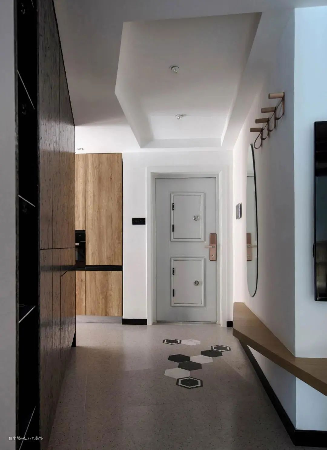2. 其次是为了节省室内空间,我们习惯在入户处设置玄关柜(鞋柜),柜子通常都会放满各种鞋子,玄关本身就是狭长的通道,空间有限,如果内开门就会显得更加拥挤。