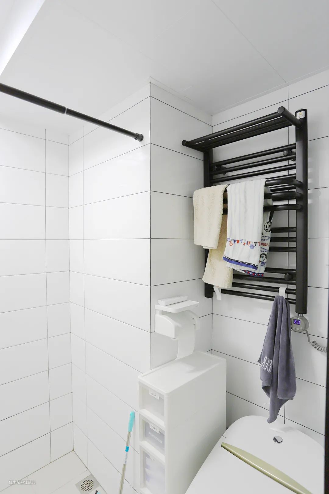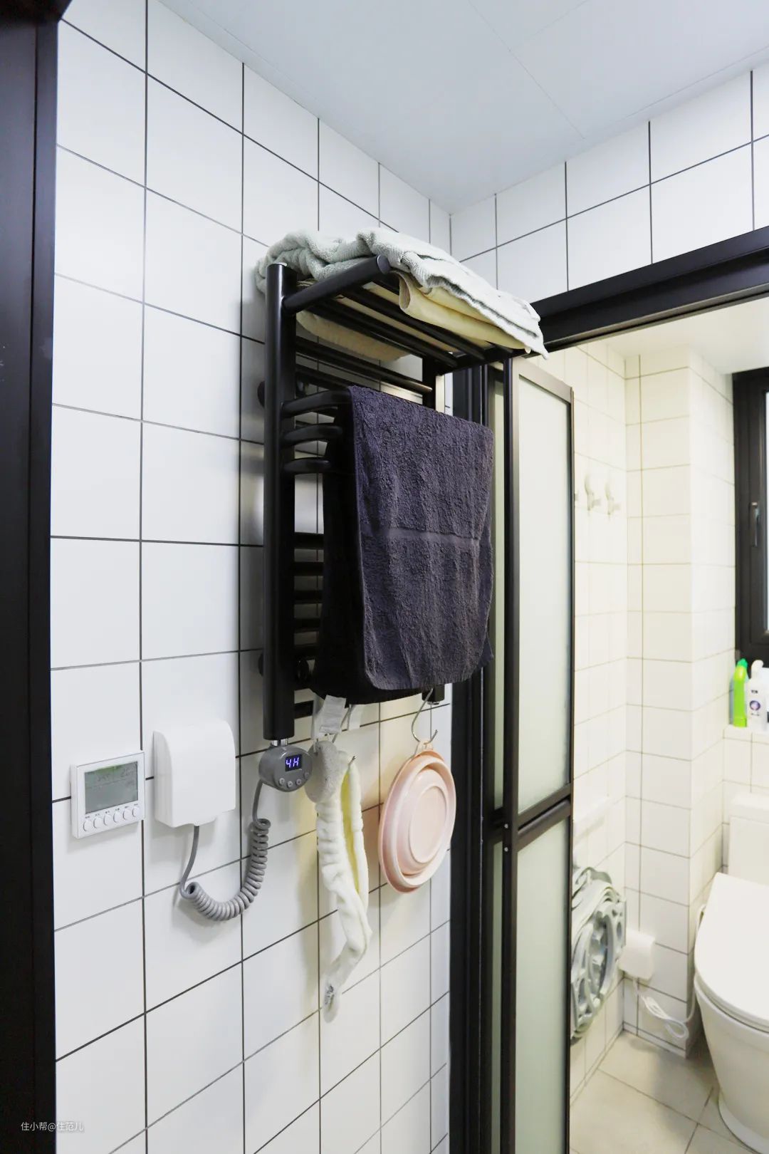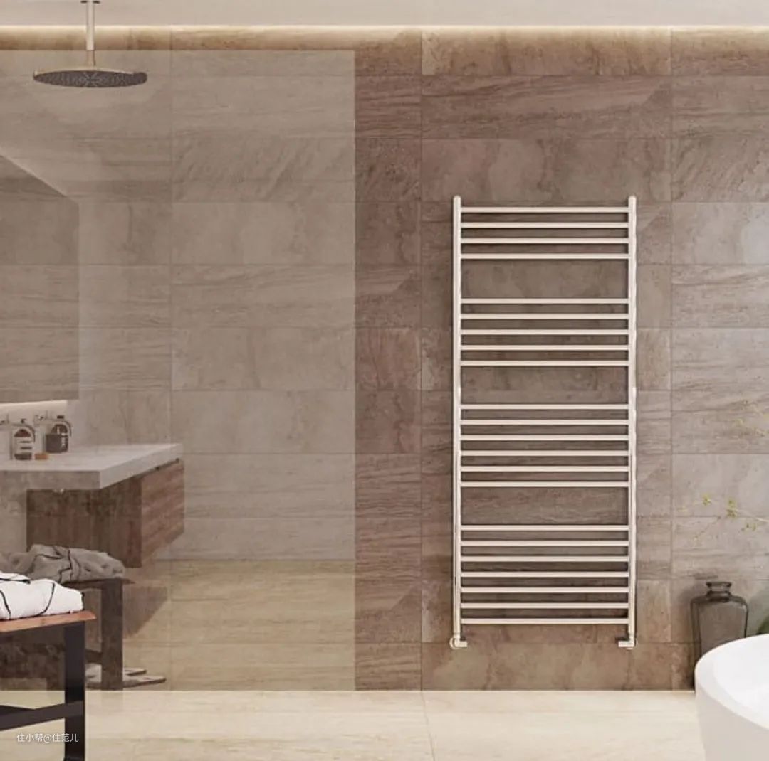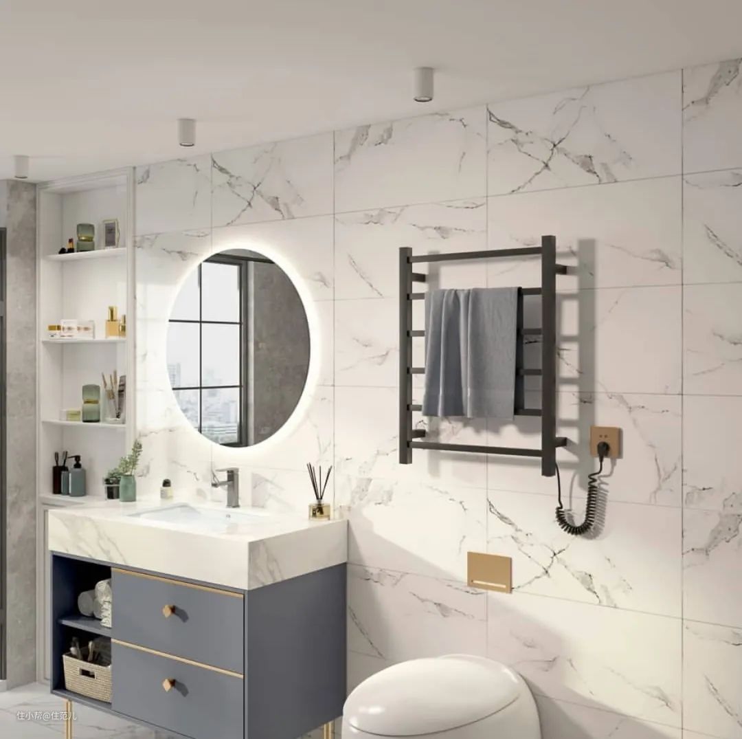 卫生间榨干每1m²做收纳的同时,别忘了上墙的电热毛巾架,简直是小卫生间收纳加分项,直接存放毛巾浴巾这类日常用品,省空间又方便拿取。