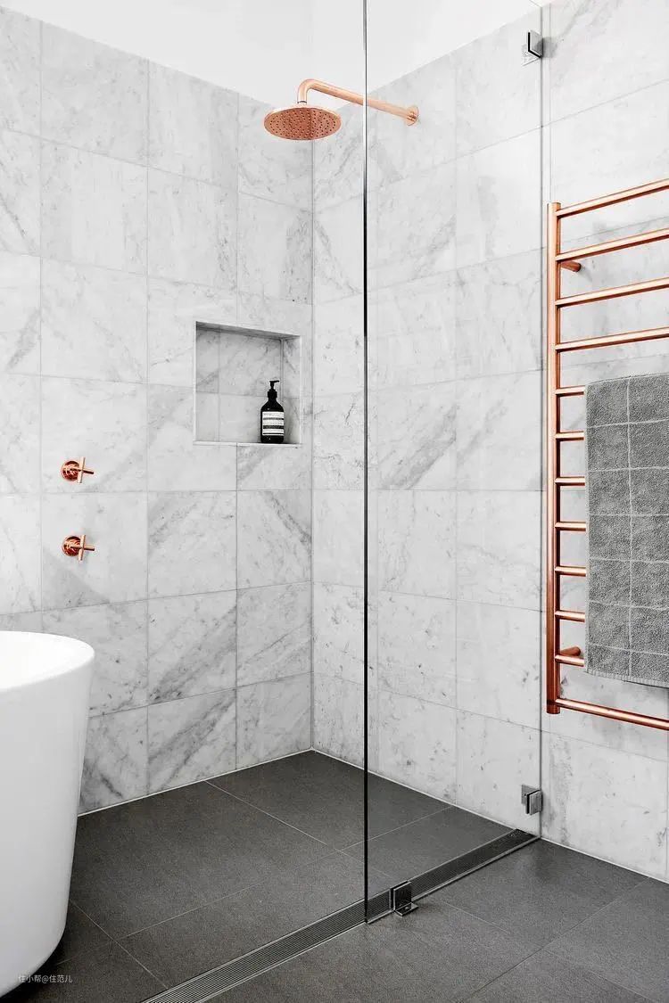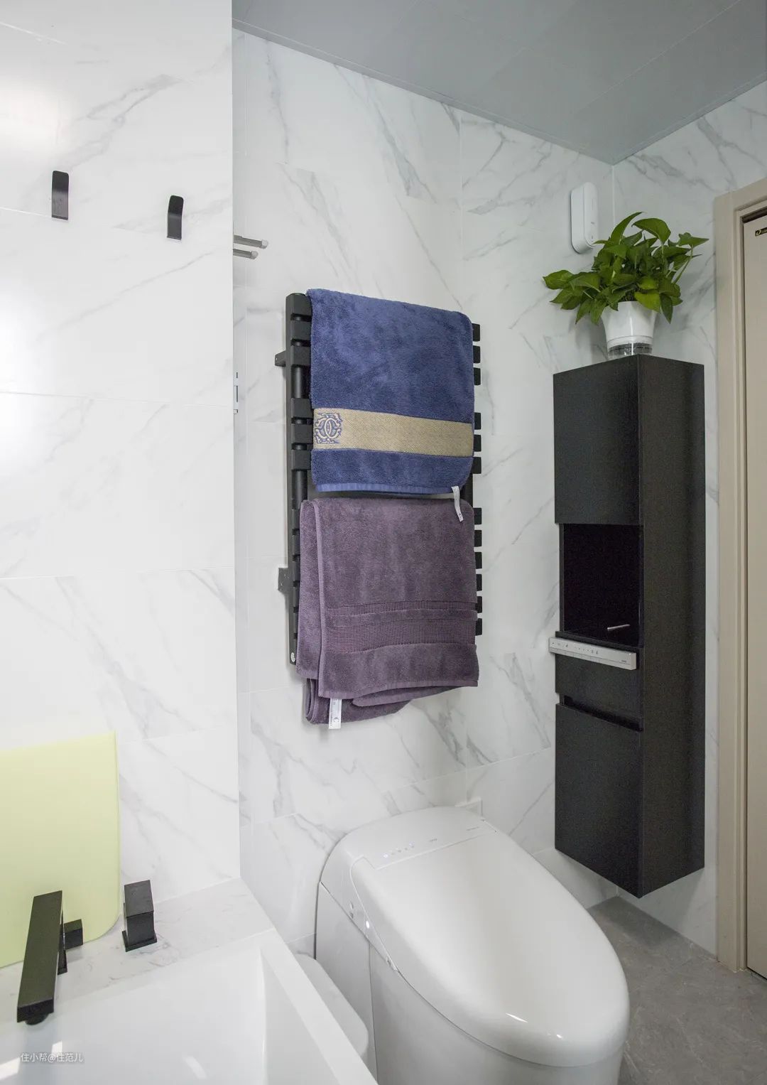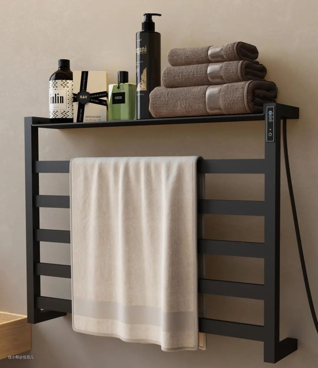 卫生间榨干每1m²做收纳的同时,别忘了上墙的电热毛巾架,简直是小卫生间收纳加分项,直接存放毛巾浴巾这类日常用品,省空间又方便拿取。