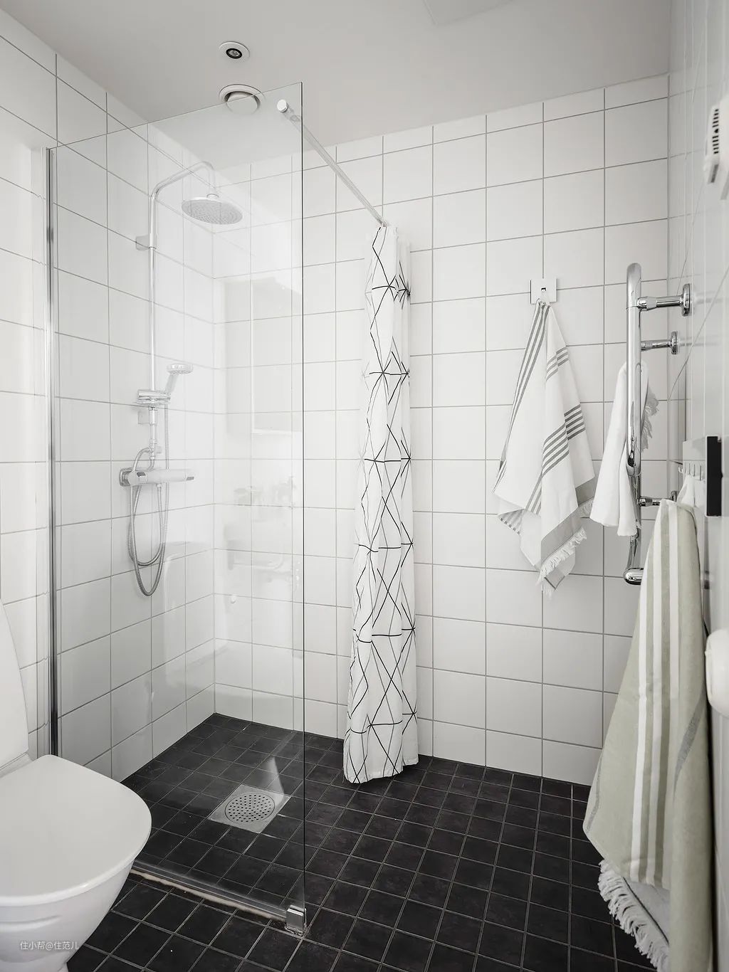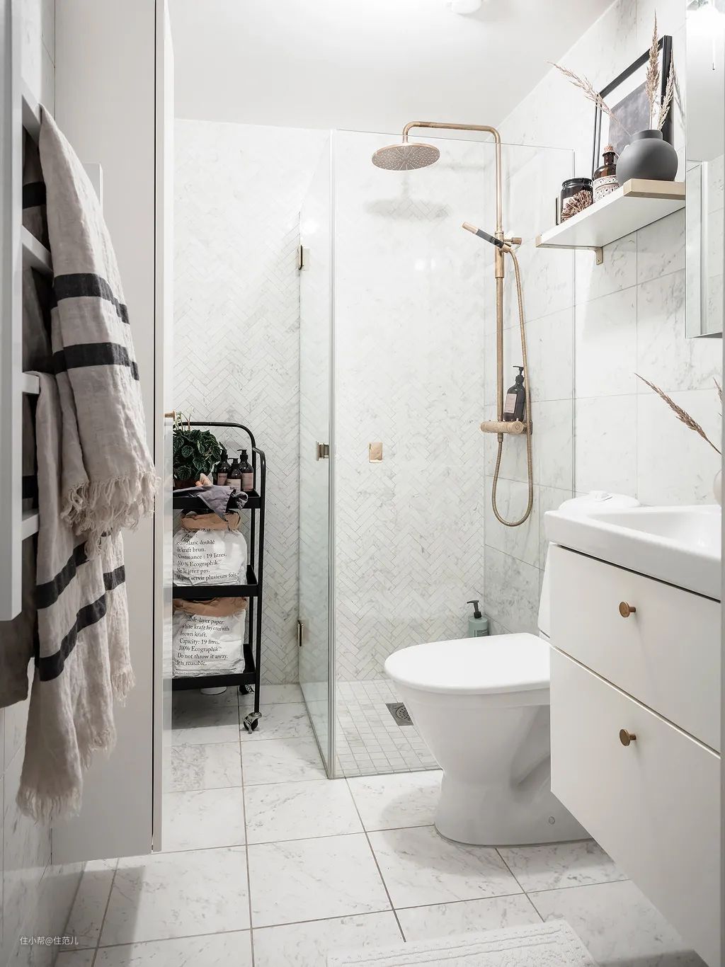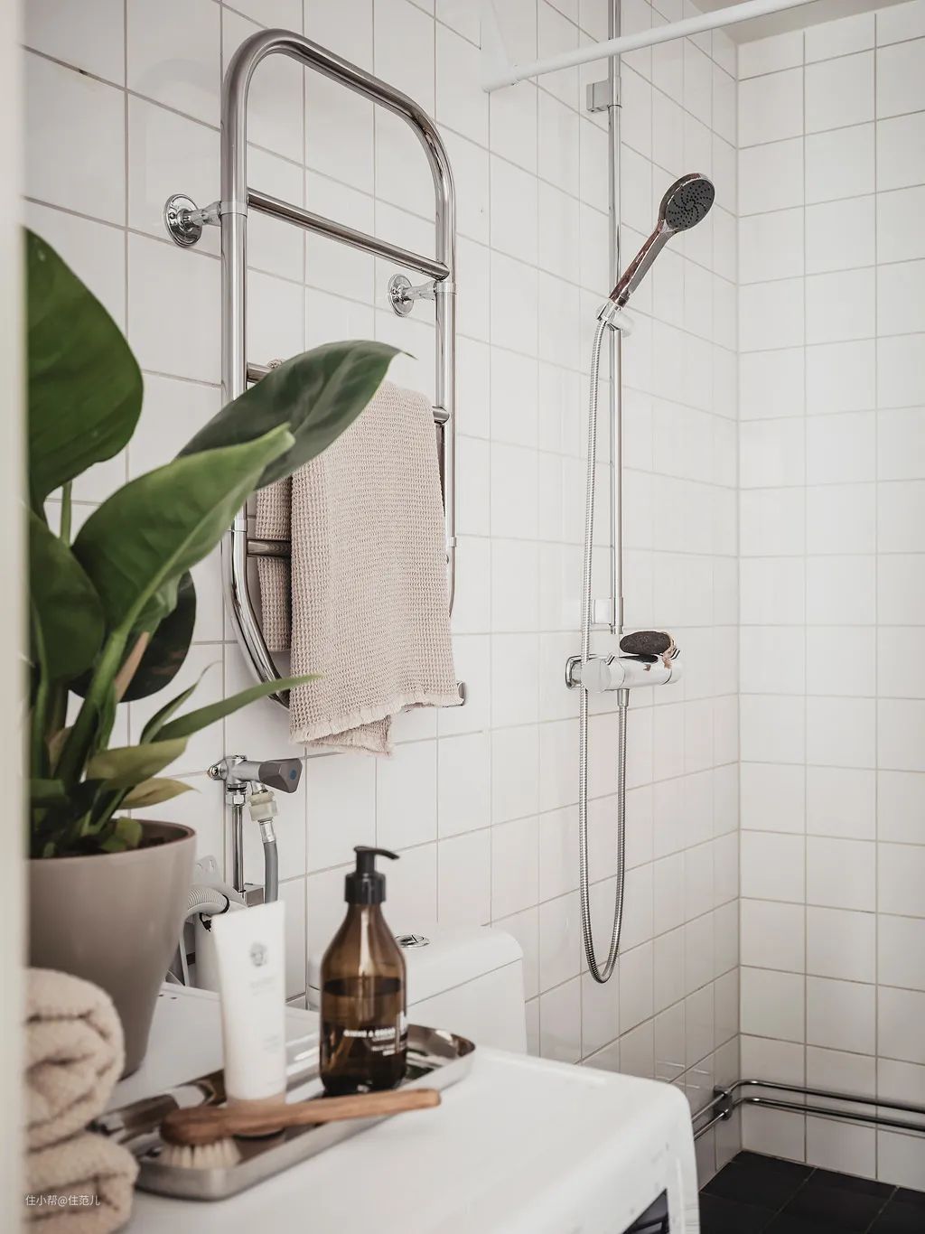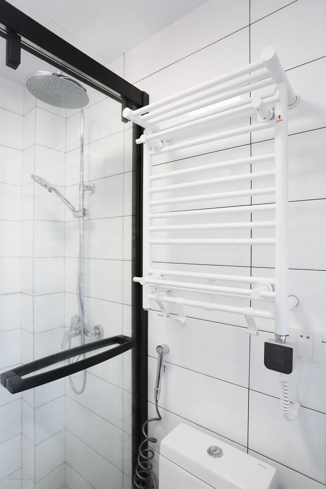 卫生间榨干每1m²做收纳的同时,别忘了上墙的电热毛巾架,简直是小卫生间收纳加分项,直接存放毛巾浴巾这类日常用品,省空间又方便拿取。
