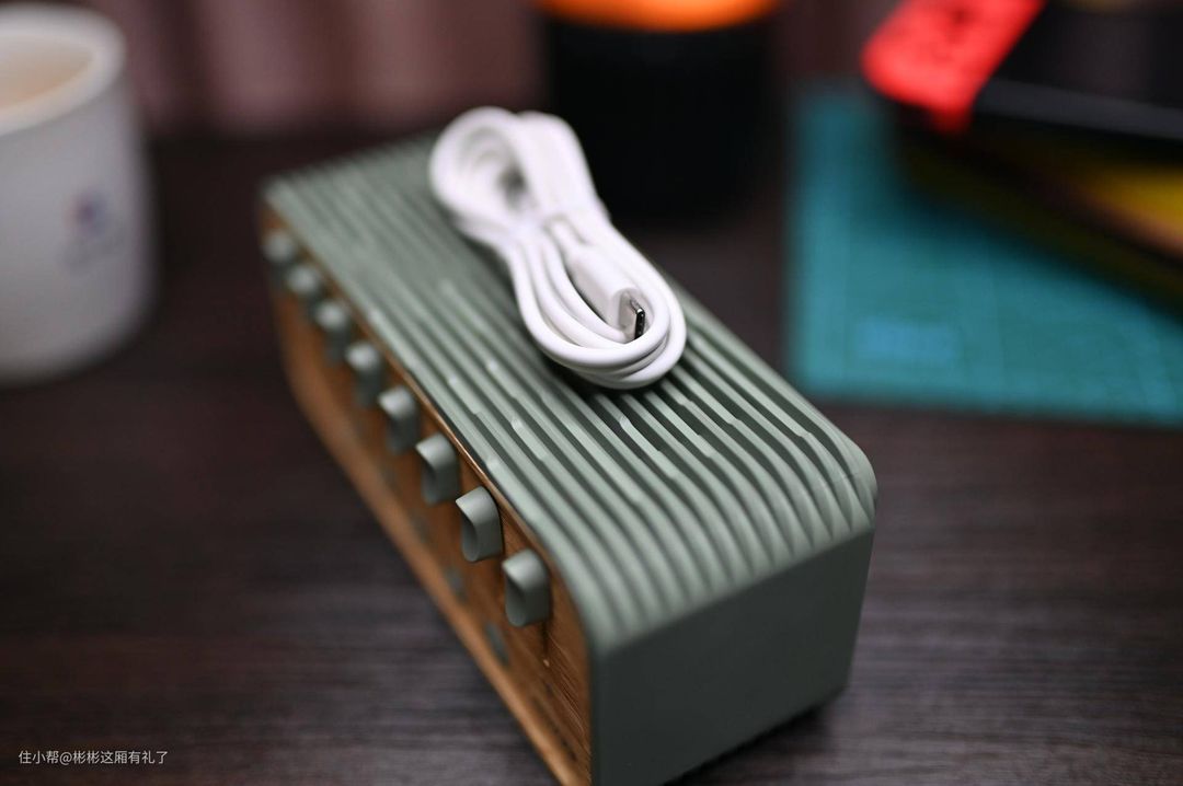 ▲包装盒还是挺美的,是一幅大自然的油画,贴合这款音箱模拟自然情景的功能。开箱之后就是音箱本体以及一根Type C电源线。音箱本身是不带电池的,只能连接电源使用。几光出个带电源的啊,以后露营也可以带上。