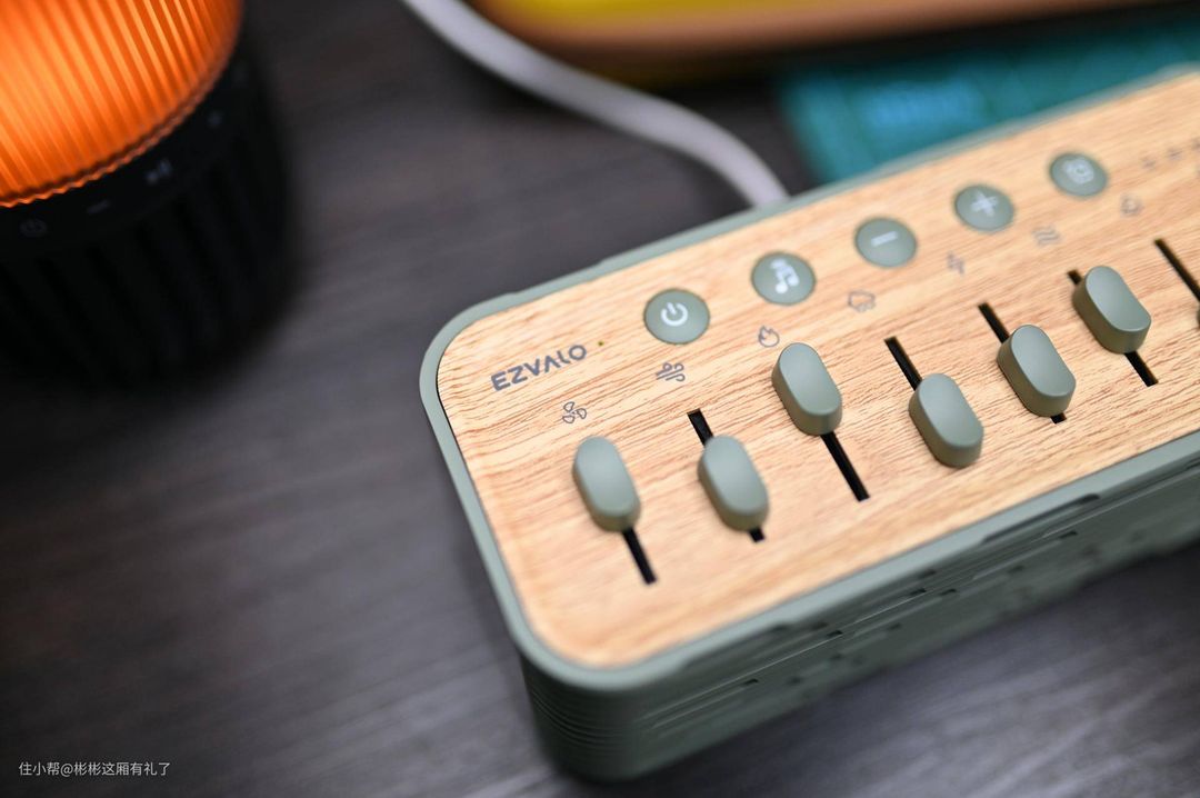 ▲插上电源,长按开关键就开机了。非常好奇的把每一个滑钮往上推了一点,声音都听了一遍。充满了新鲜感,八种自然的声音非常的真实自然,比如风声、篝火声、雷鸣声、流水声,虽然能感觉到是循环播放,但衔接之处听不出断续。