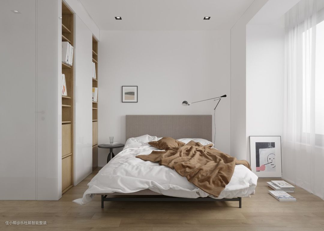 次卧更像是个现代简约风格的空间,为了搭配全家的日式主题,左侧储物柜做成原木色。