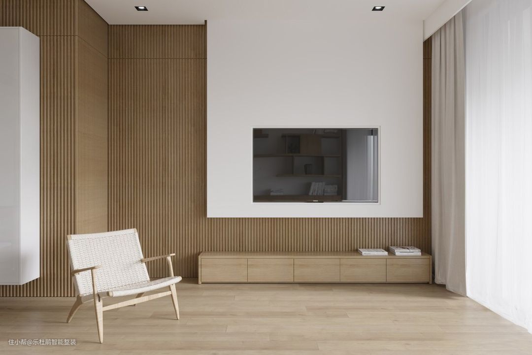 客厅采用木色为空间主打基础色,以浅灰色和白色为辅助色。严谨安静的色彩,让空间展现出优雅干净之态颇有东方禅思禅韵。