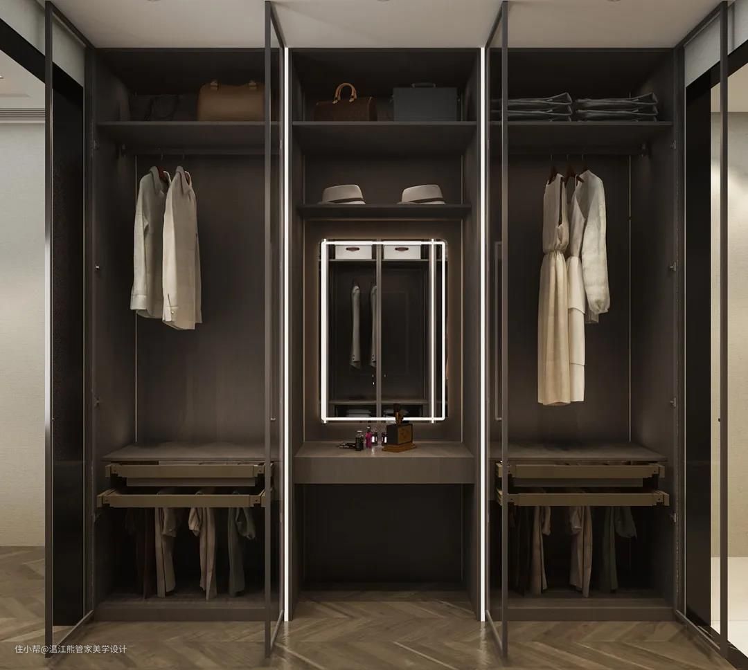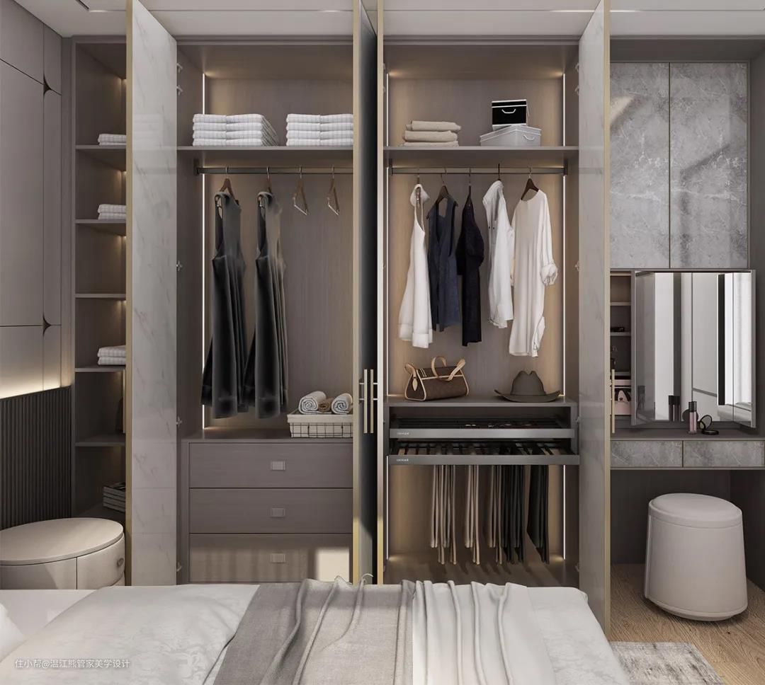 空间规划做好了,卧室里面还能做步入式衣帽间。步入式衣帽间的储存空间完整,衣服陈列整齐,存取方便,有充裕的活动空间。