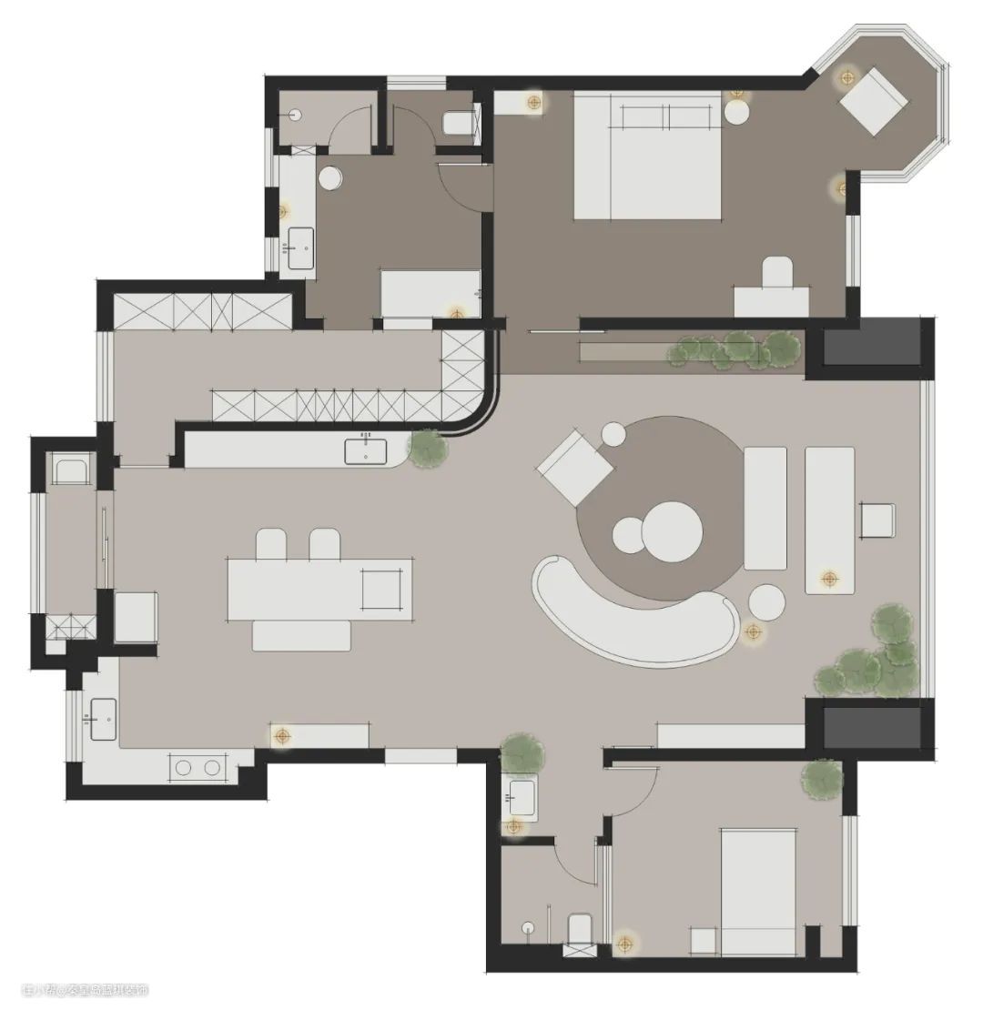 而圆形的暖色地毯将这一切衔接起来,有反差而不冲突