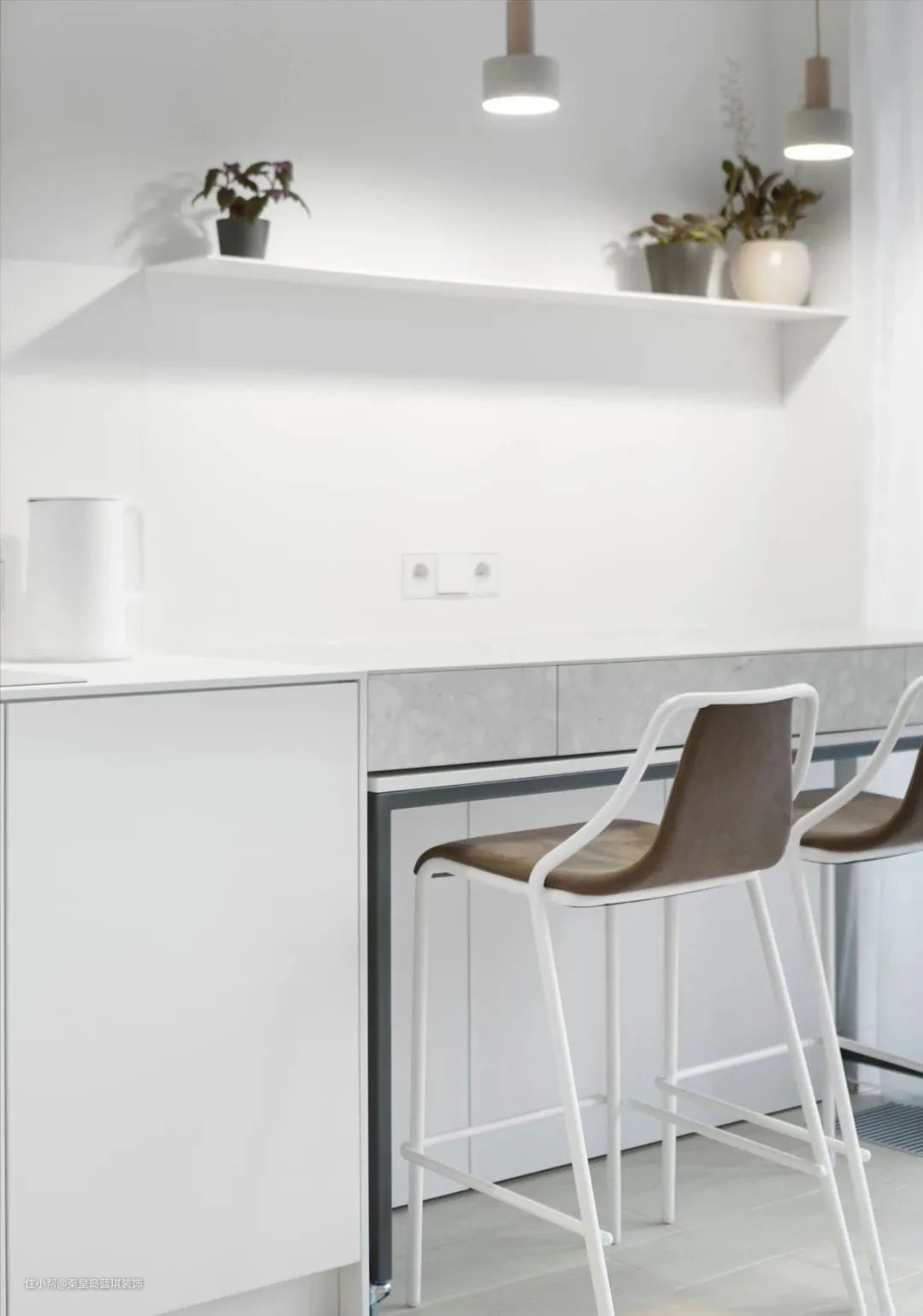 白色的隔板上摆放着小盆绿植