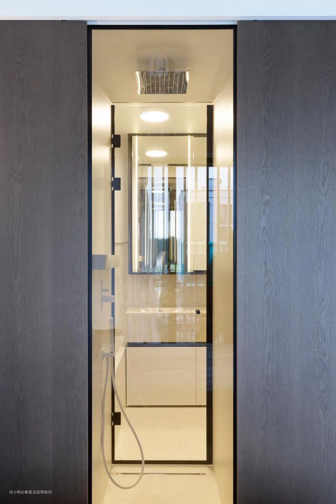 洗手间的门隐藏在玄关的镜墙之中