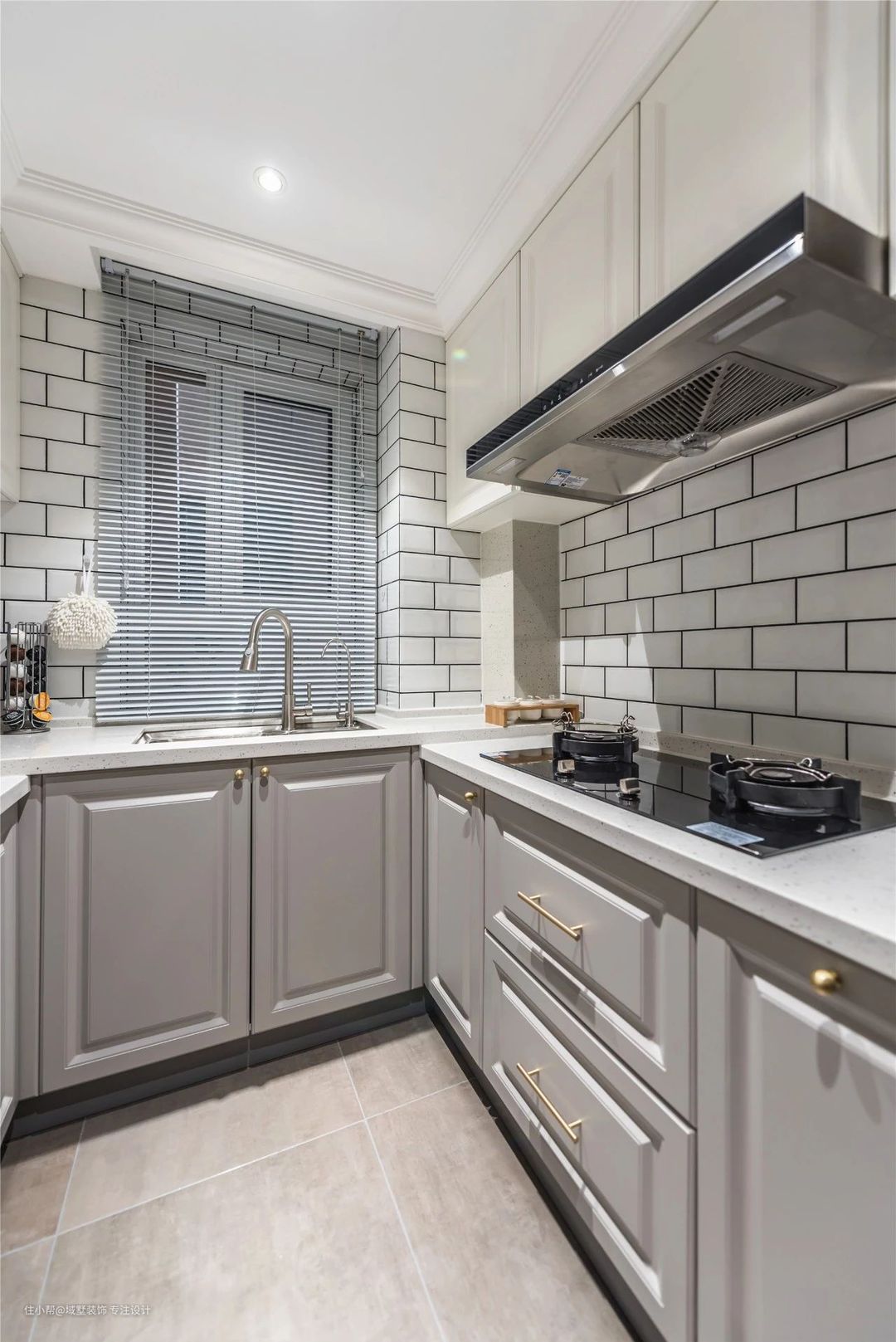 厨房的柜体延续了客厅的灰色系,加上红铜的把手让整个空间更加有品质感。