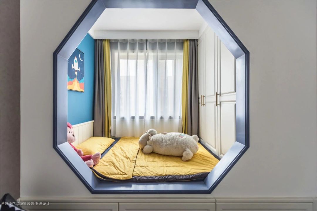 儿童房榻榻米的设计,用了一个太空舱舱门的设计手法。让原先传统呆板的榻榻米显得更生动有趣,里面是睡觉休息的地方,外面则是小孩子玩耍的空间。等孩子大些的时候加上书桌便可以解决学习的需求。