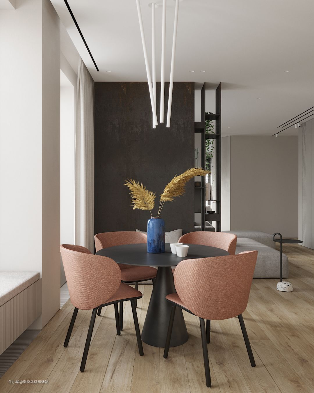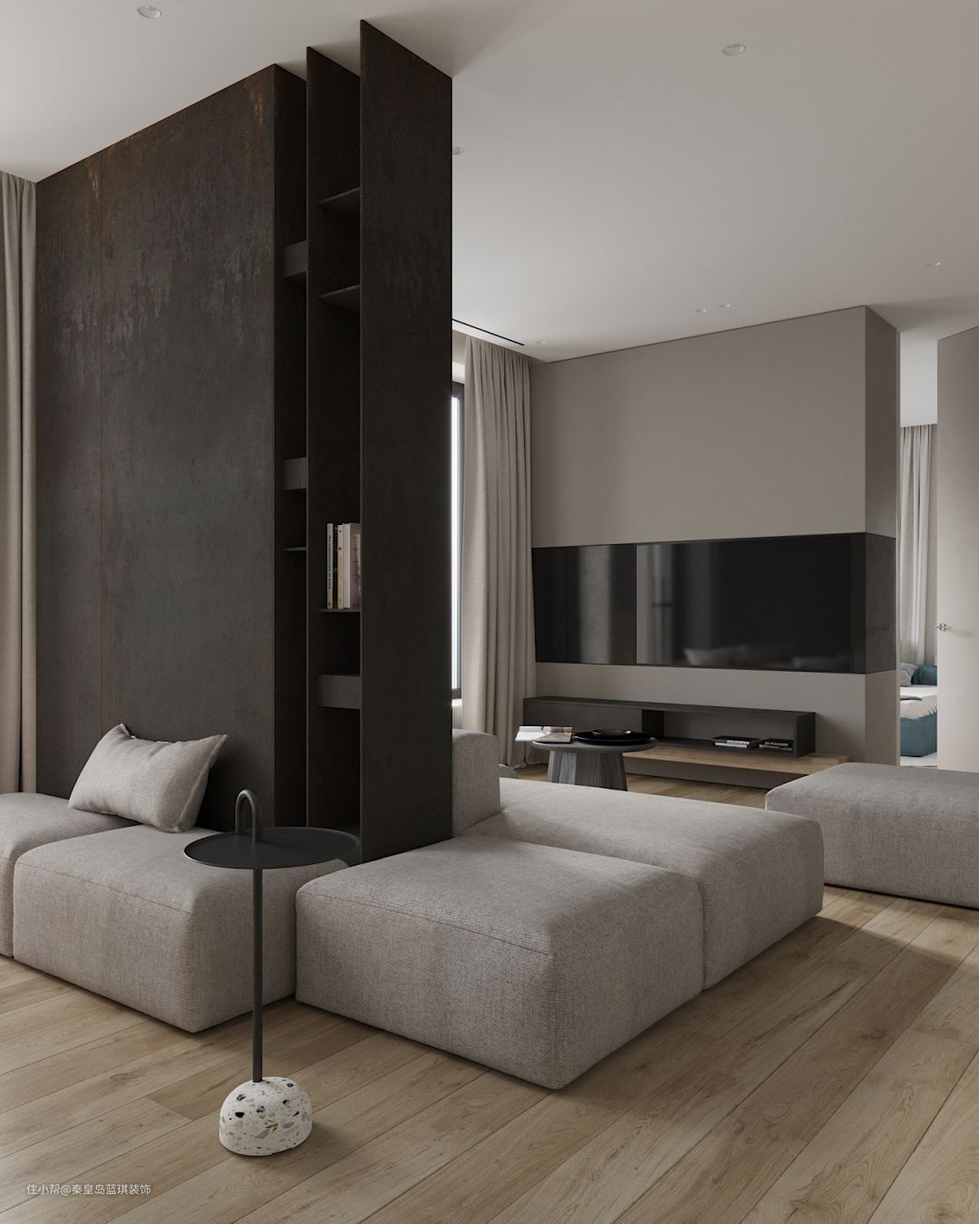 在这间93㎡ 公寓中,利用锈蚀感墙面材质架构兼具