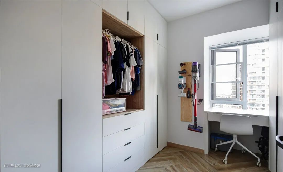 储藏能力非常强大,不仅放衣服,家庭换季的被褥、平时不用的小杂物都可以放在里面,门一拉全部衣物都隐形了。还有个小窗景书桌,发呆、放空自我的好角落。