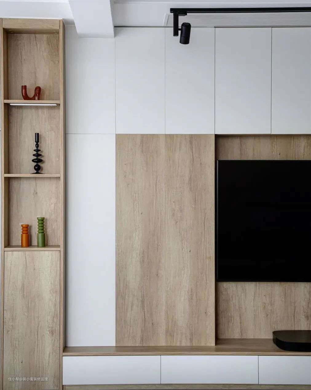 电视背景墙和顶天立地柜结合,有娃的家庭在设计时,收纳就是最大的诉求。东西多却又“空无一物”的秘密,就在收纳柜。朋友说屋主家,简直是收纳狂魔,把各个空间都利用到了极致,连过道边都是收纳柜。