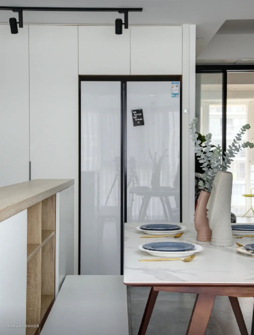 过道收纳柜的尽头,留出一部分空间,内嵌入冰箱,白色西门子冰箱,视觉上和高柜、周边柜子融为一体,极度舒适。