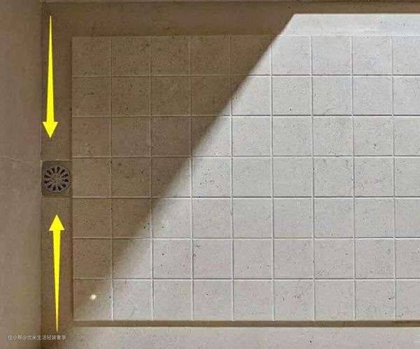 5.半对角线铺贴:地漏位置正好在紧贴墙面的地方,瓷砖按对角切割,铺贴时同样要向墙角倾斜,使地漏处于下陷点方便排水。