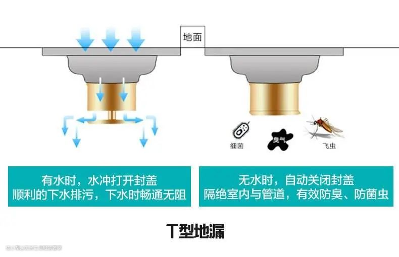 T型地漏属于自封式地漏,直通式排水,排水量大速度快,通过承载水重而改变挡板的闭合状态,实现排水和防臭。这种地漏适合安装在用水不多的地方,如厨房、卫生间干区、阳台、露台等空间,尤其像洗衣机排水在短时间内就要放掉大量水,所以排量大的T型地漏也是很好的选择。