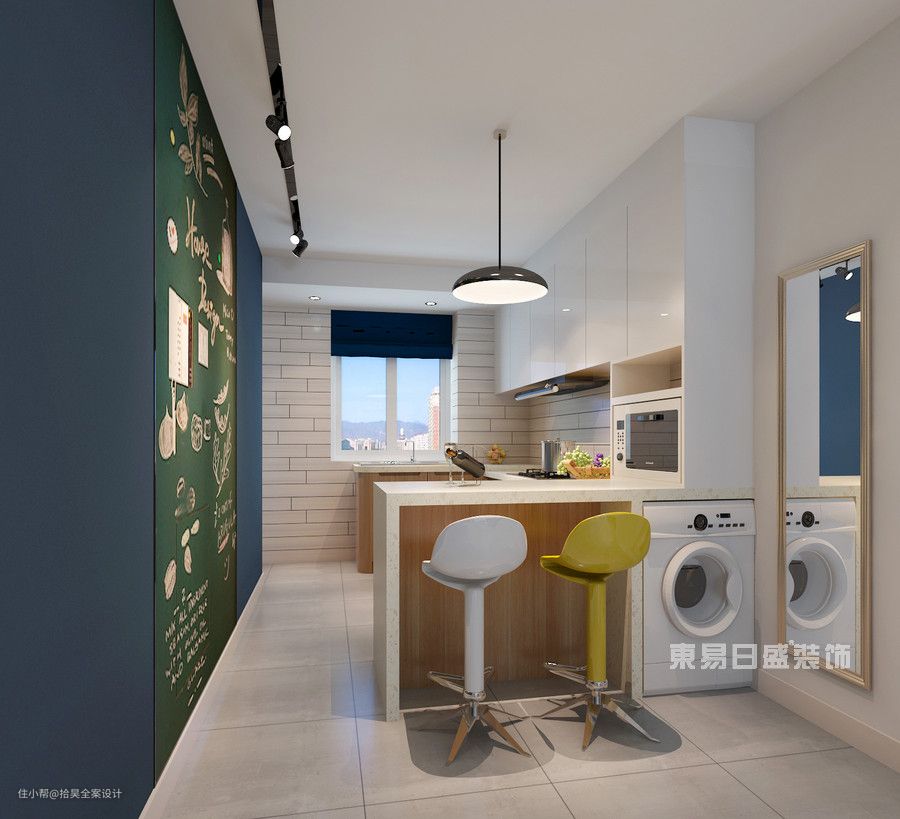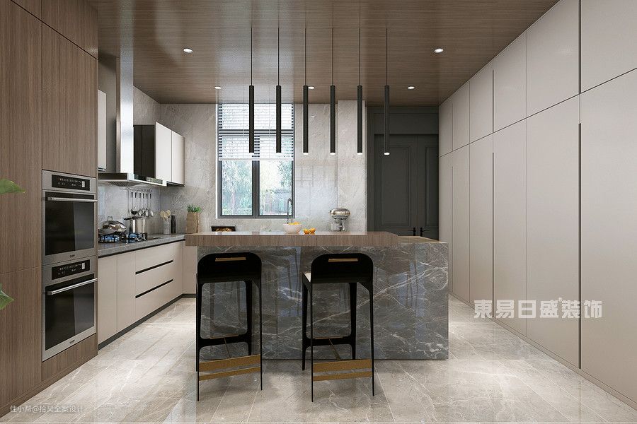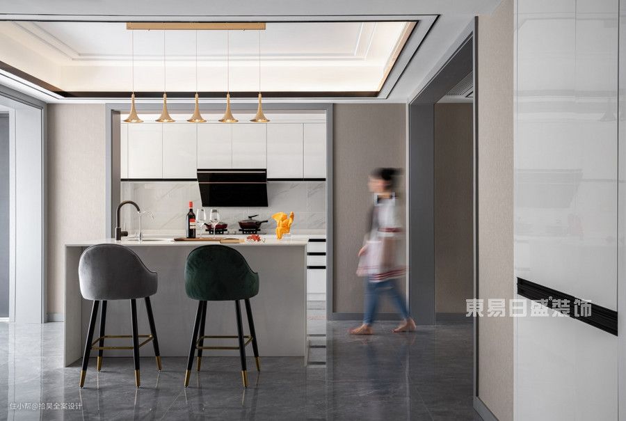 把岛台与吧台相结合,形成一个整体,可隔断厨房与其他空间,提供操作、收纳、休闲空间。