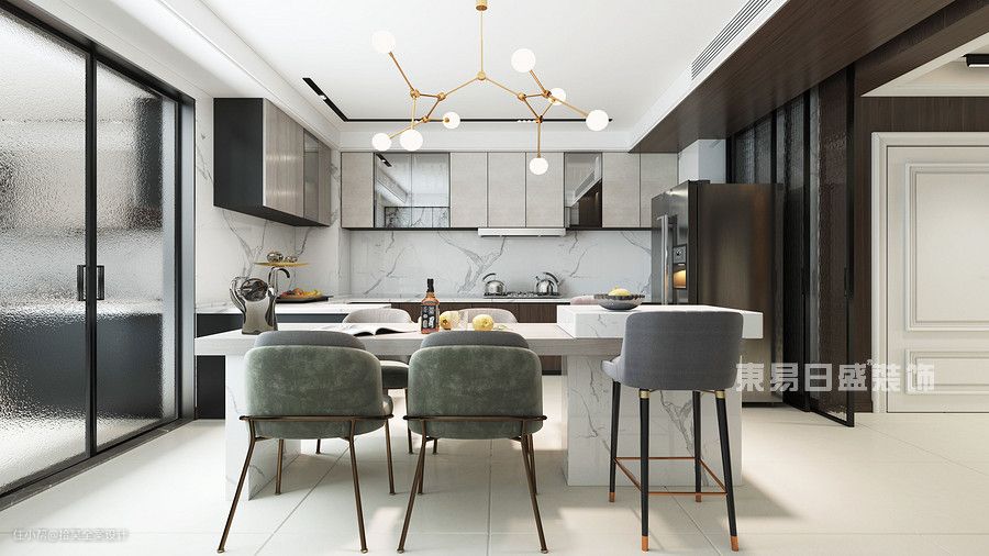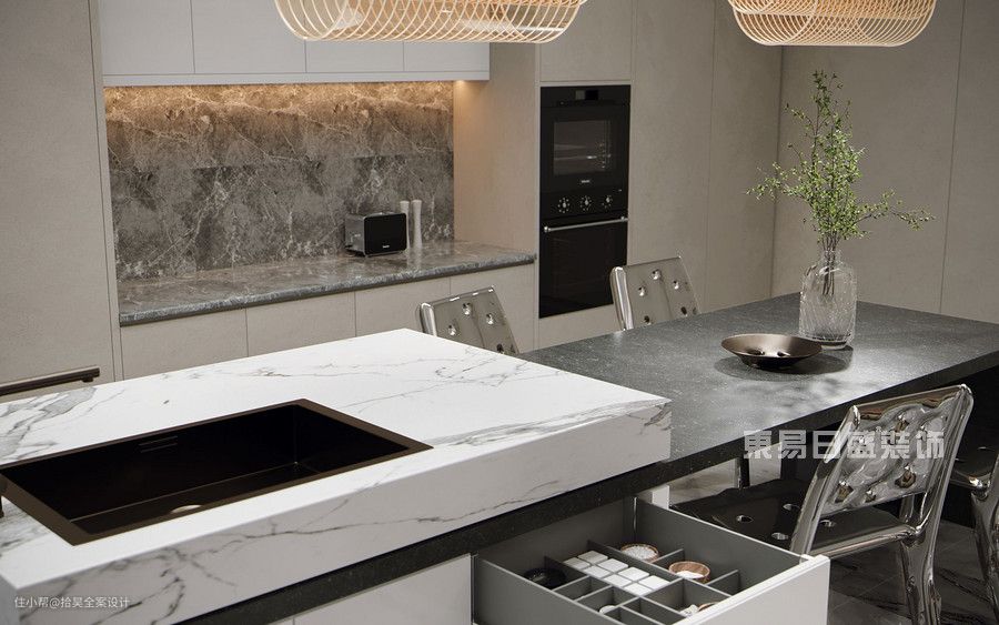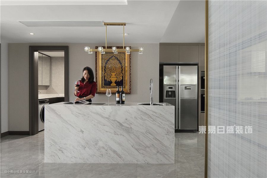 在开放式厨房设计中,岛台作为厨房延伸的一部分,不仅可以作为工作备餐区,也能作为与家人互动的休闲区,还起到隔断装饰的作用。