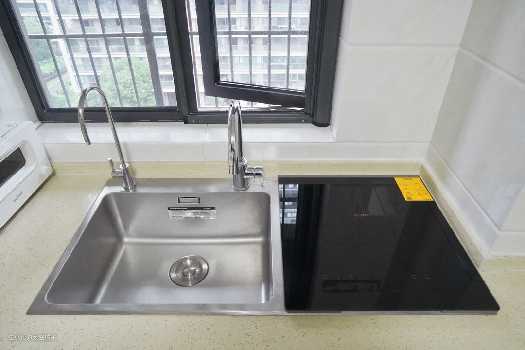 需要注意的是,以前的旧水槽是内嵌在台面里,所以水槽的高度要略低于台面,但是新换的方太K3B是突出于台面的,所以肯定有朋友觉得会不会漏水。