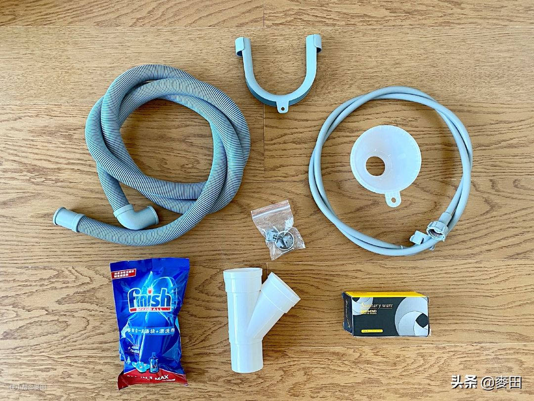 附件全家福:三通角阀、下水三通、排水管挂钩、进水管、排水管、软水盐漏斗、洗碗筷和亮碟剂试用装、
