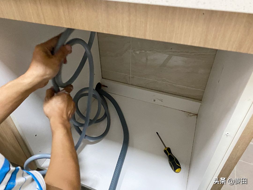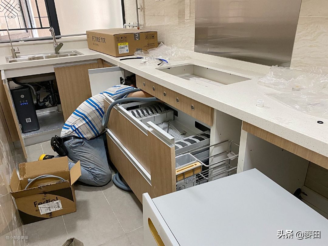 提前跟师傅说好,我们家需要打孔让他带好工具,师傅问我是不是打大理石,没有提前做功课的我确实不知道打孔要打在什么位置。结果师傅来了之后跟我说他带的工具不能打橱柜面板,而且我们这洗碗机的位置距离厨房净水太远,要从整个橱柜穿过去还真是有点麻烦。