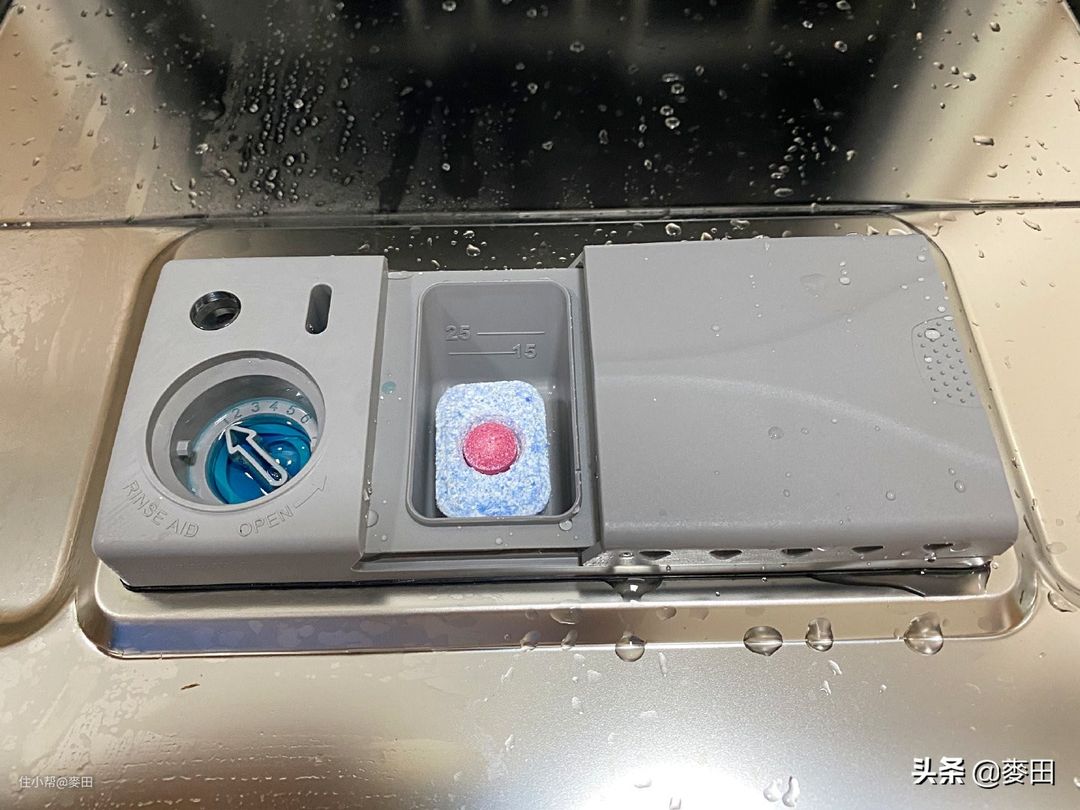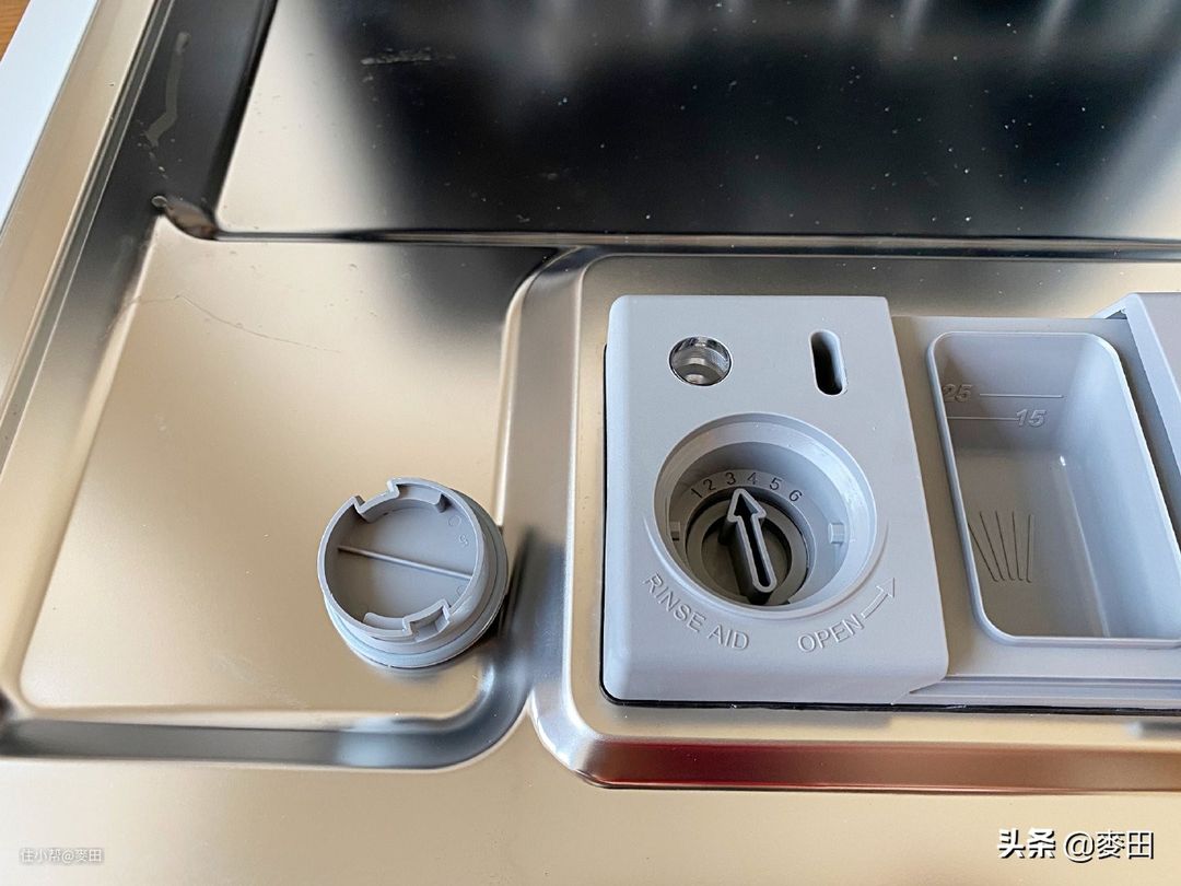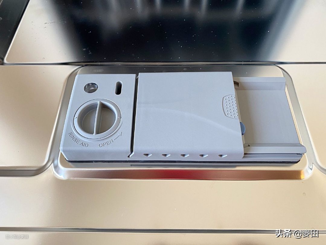 事先并没有做太多功课,只能对照着使用说明书慢慢做研究。舱门上有两个清洗剂加注仓,左边需要用旋钮拧开的是亮碟剂仓,按下右边蓝色小块即可打开洗碗块仓。