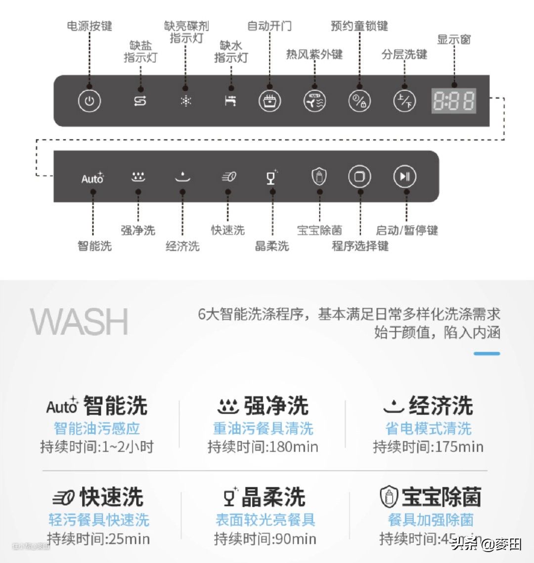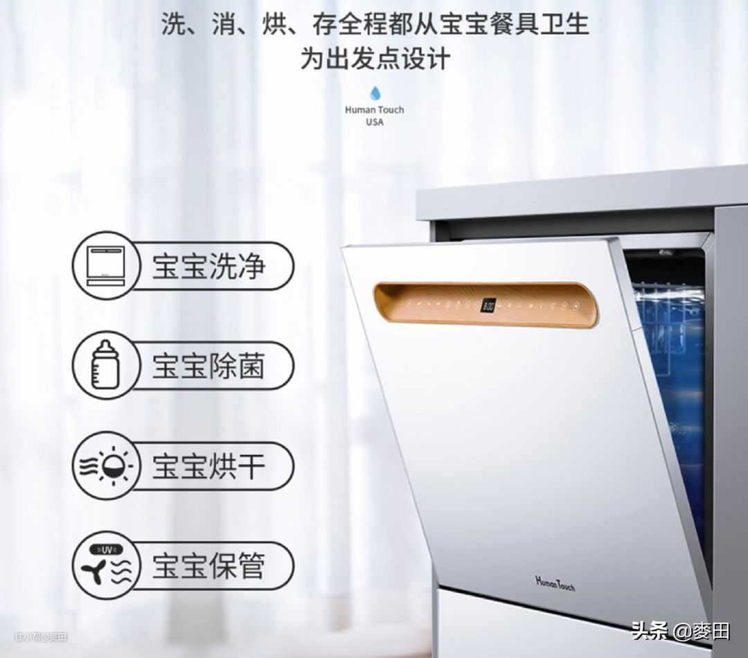 颜值上来说,白色的钢化玻璃+樱桃木纹控制面板很有档次,与我们家厨房的风格也很搭。自动开门而且自动烘干的功能大赞!上下分层清洗解决了大多数人餐具不够进洗碗机的困扰。最让我们开心的是,宝宝清洗和宝宝除菌功能,清洗宝宝餐具以及玩具不要太方便。可以说,这是一台为现代有宝宝的家庭量身打造的洗碗机,个人觉得有家有宝宝的家长们都可以研究看看。
