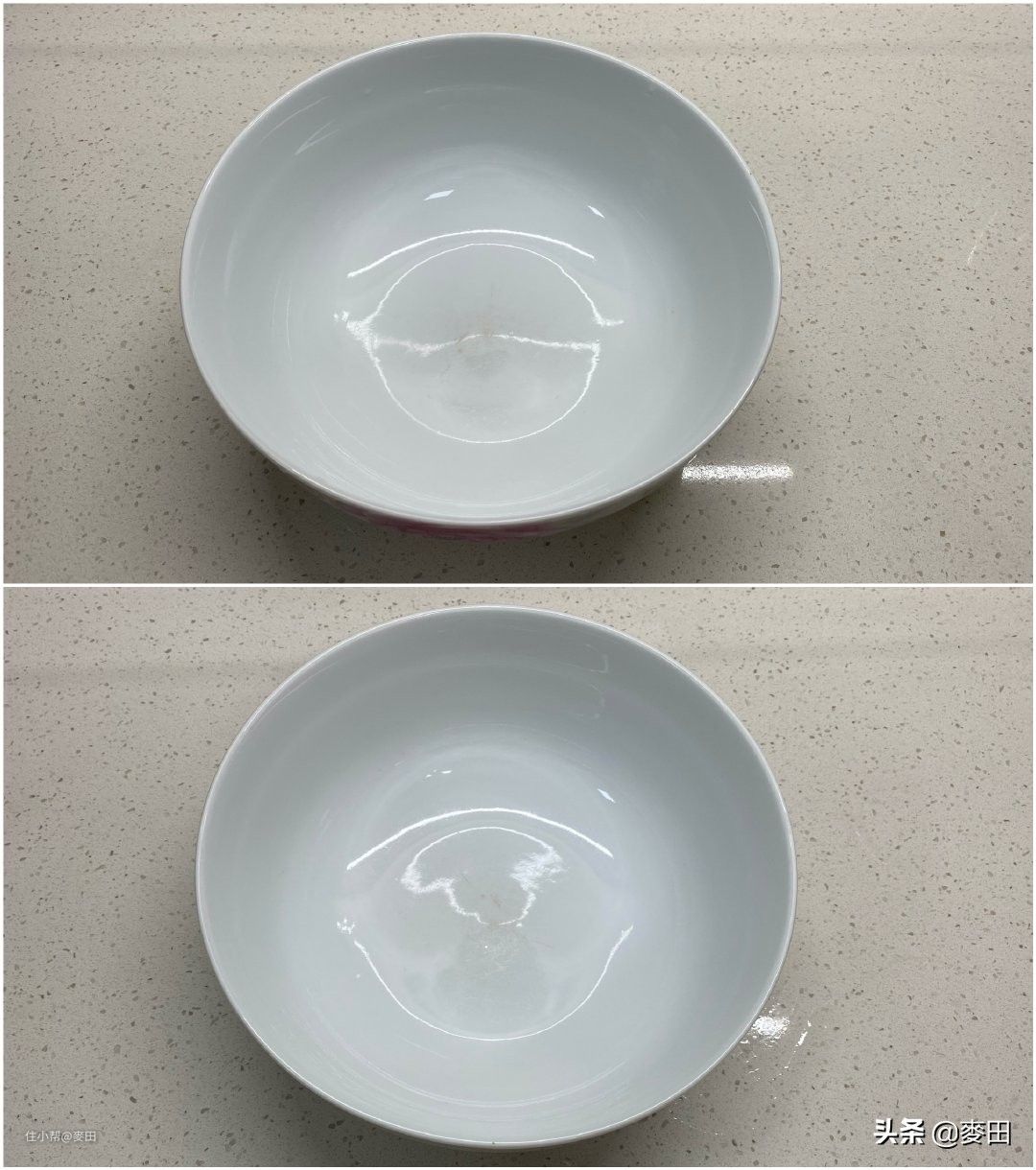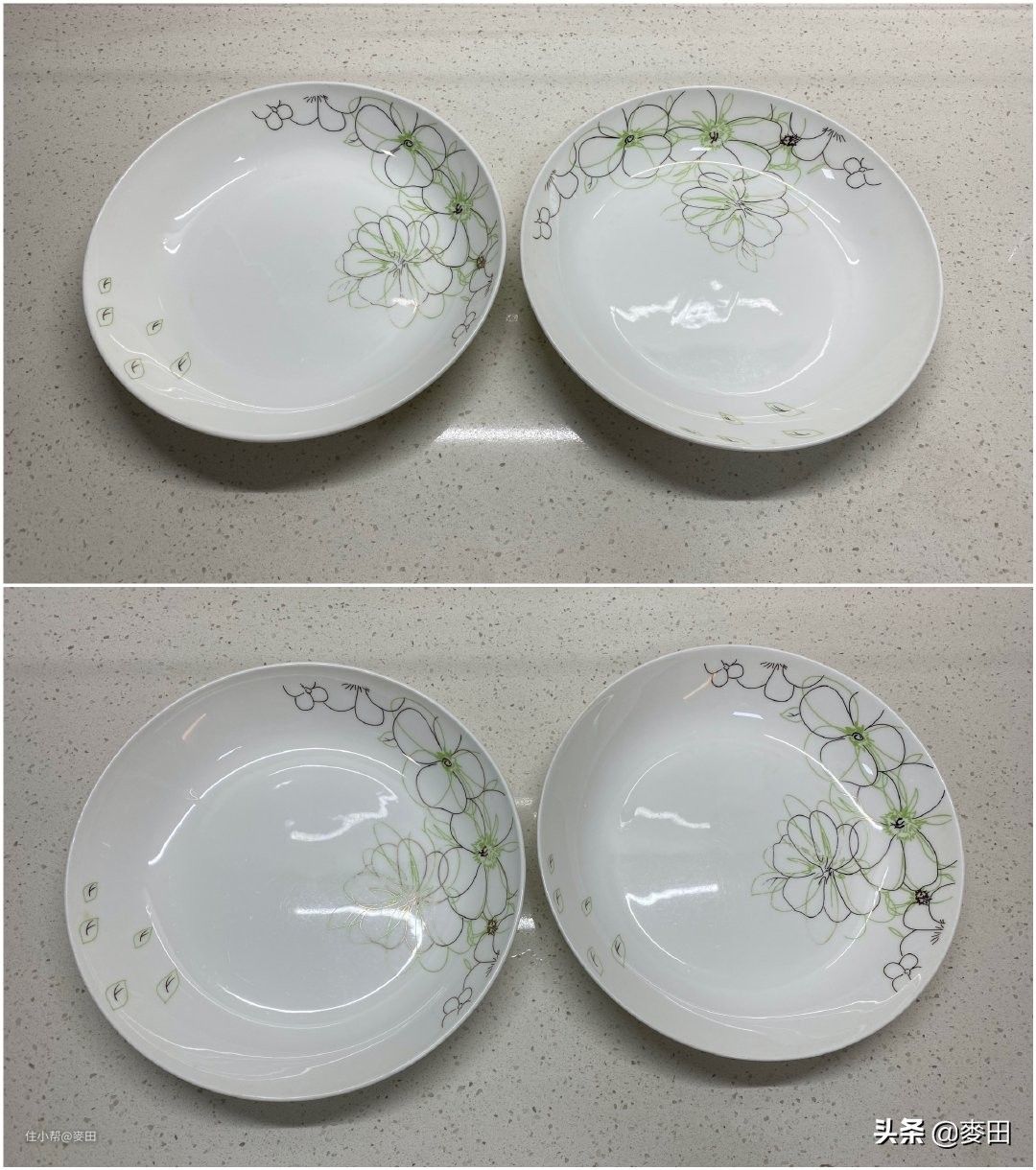 由于拍照技术有限,两个碟子上下对比可能不那么明显,但是肉眼可见的上面两盘子上之前的顽固污渍有被清除掉。
