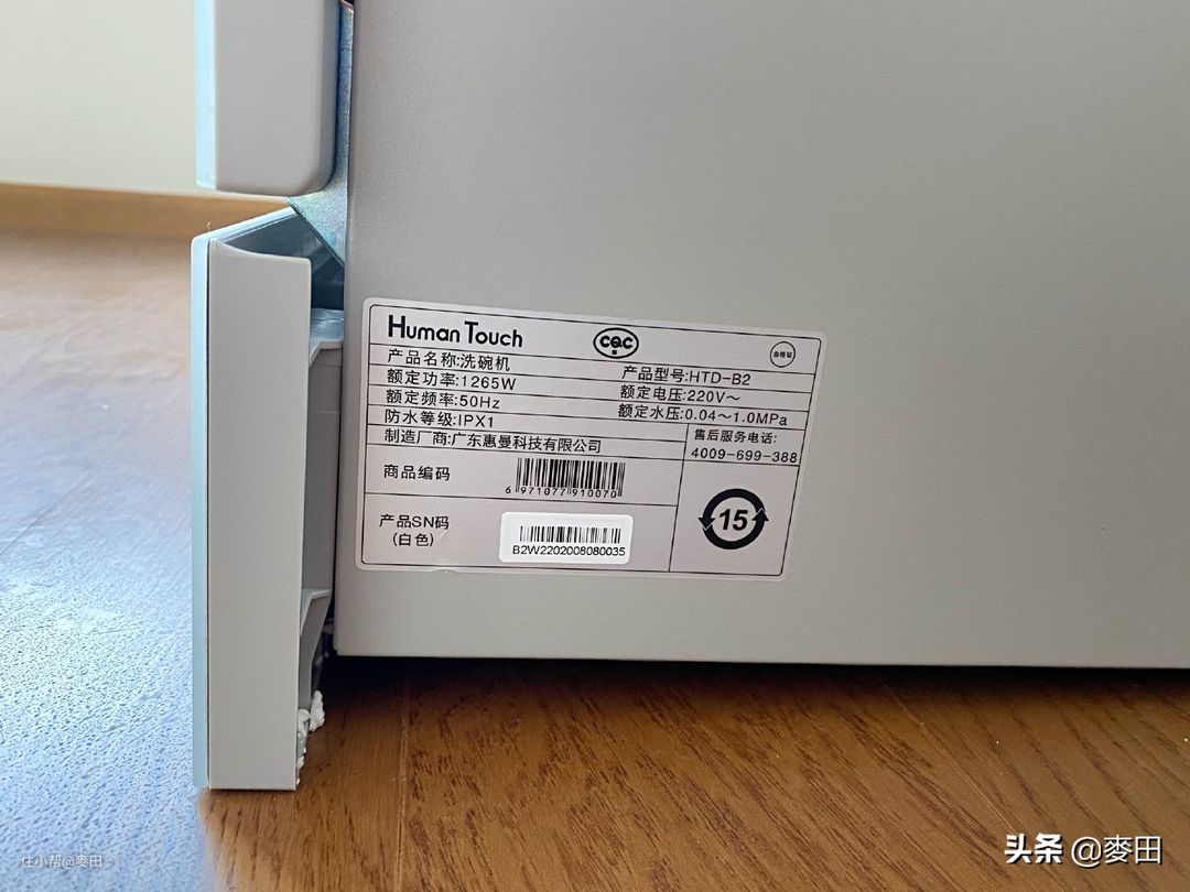 左侧下方有这款洗碗机的一些参数,额定功率为1265W,额定电源220V。额定水压:0.04MPa~1.0MPa,这个参数让我有点惊讶,意味着只要水管能够放水进洗碗机,那么就可以使用。