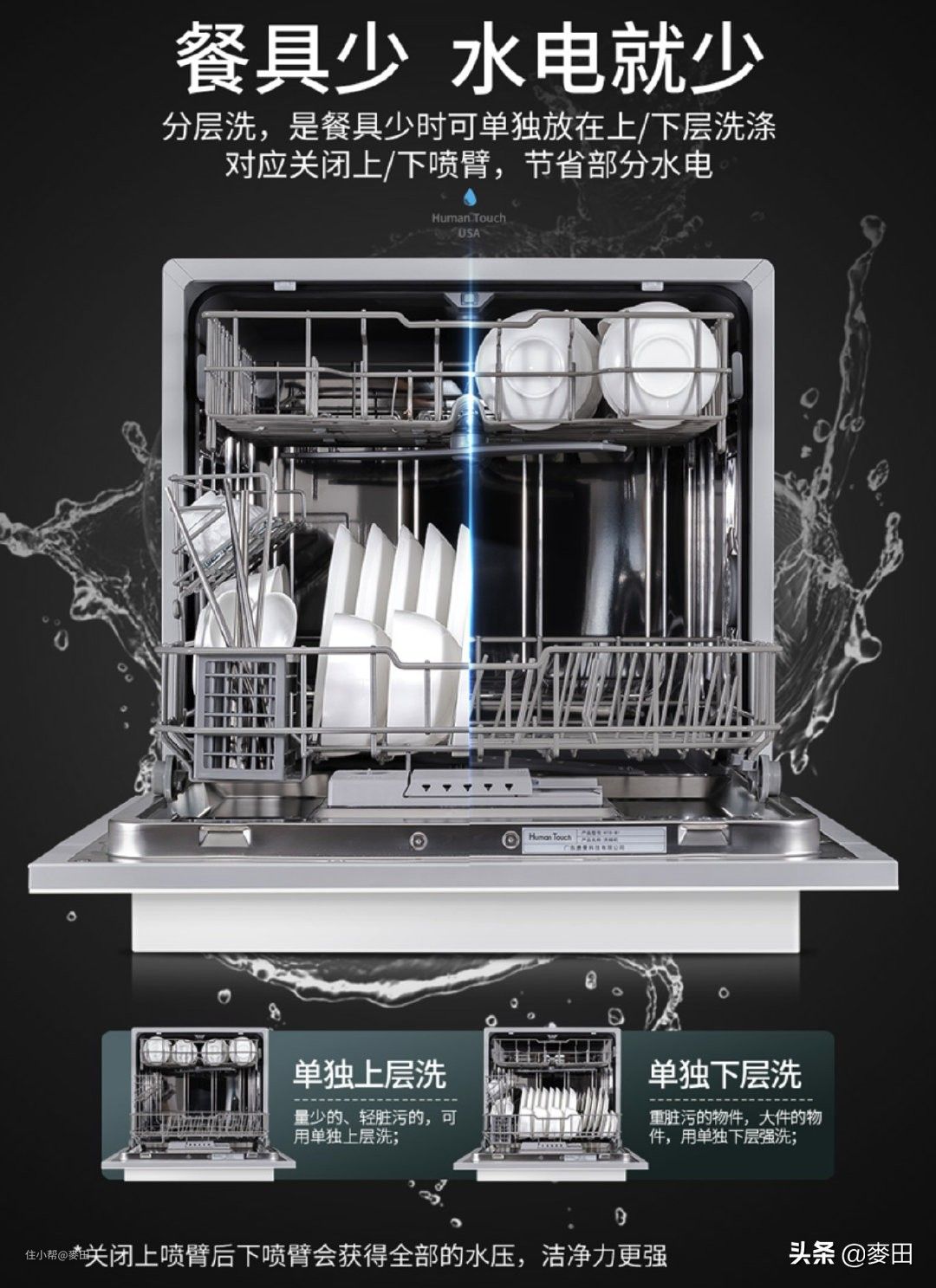 慧曼这款洗碗机是支持单层清洗的,如果家里人不多,一顿饭用不了那么多餐具,又不想存几次的碗一起洗,那么你可以选择单层洗。省水省电的同时,关闭一层喷臂可以使工作的喷臂有更高的压力,也不用担心是否能清洗干净的问题。