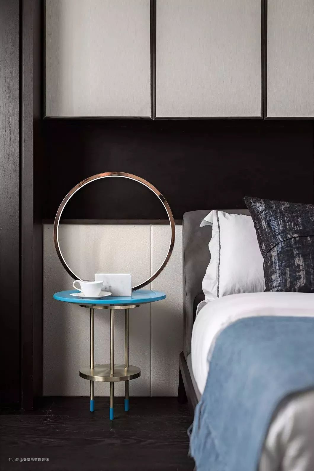 二楼次卧在陈设形式上摒弃了繁冗复杂的技巧,家私造型以简洁硬朗的线条为主。汽车元素与皮质、金属、石材等碰撞,辅以蓝色系修饰,增添了几丝柔和,让生活跟质感达到完美平衡。