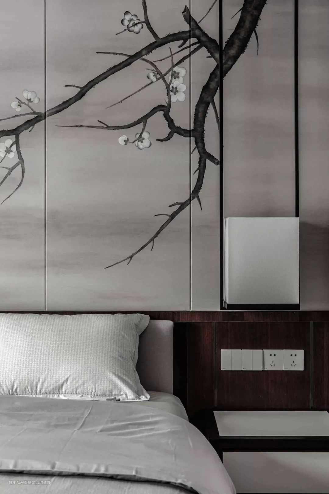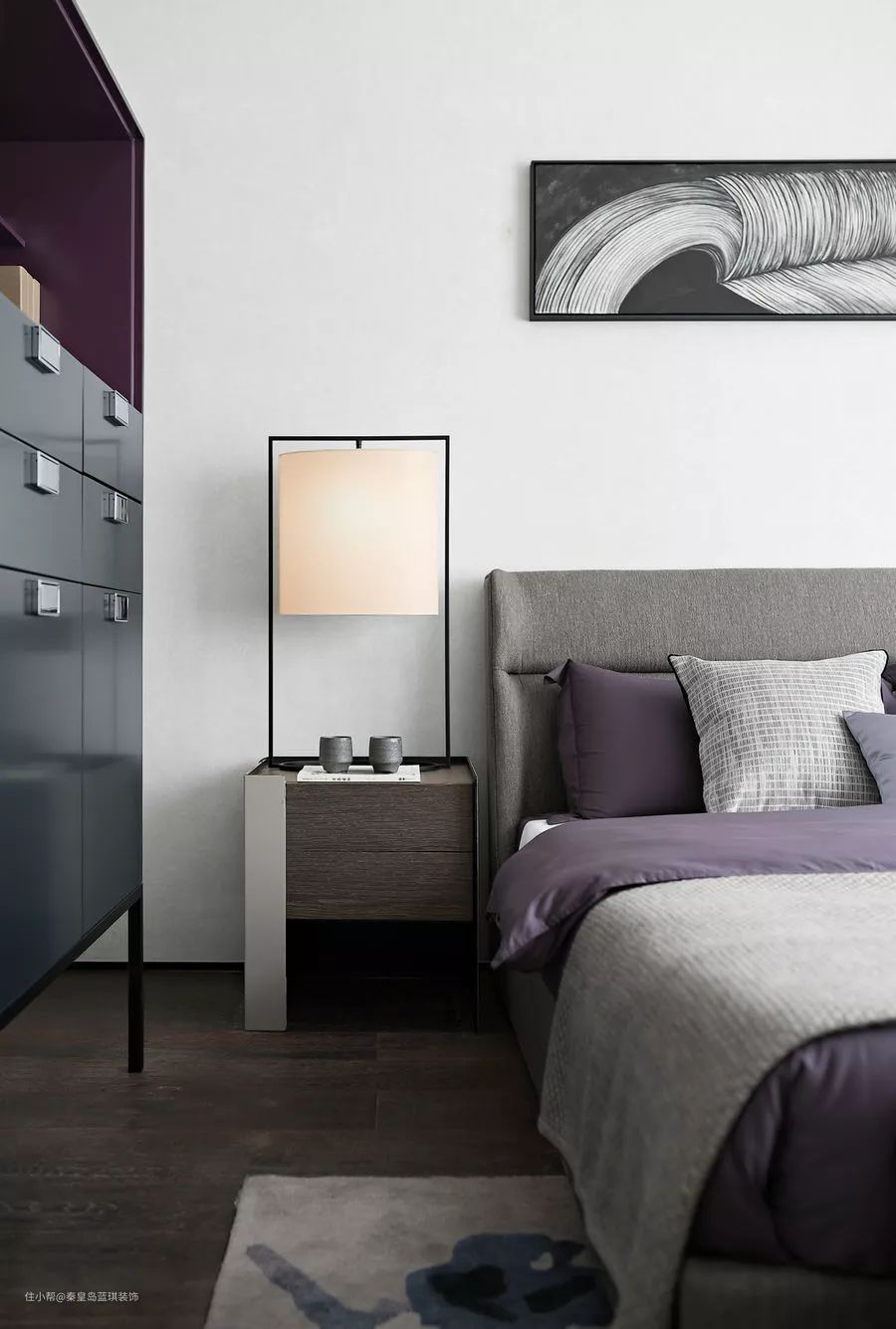 浅色系统合的长辈房,平和静谧,似有古雅雍容的境界。上方飘逸的挂画与韵律明显的柜体为长辈房增添了协调感。紫色、灰色、褐色、黑色、银色,在设计师的巧思布置下多而不杂,和谐互融。