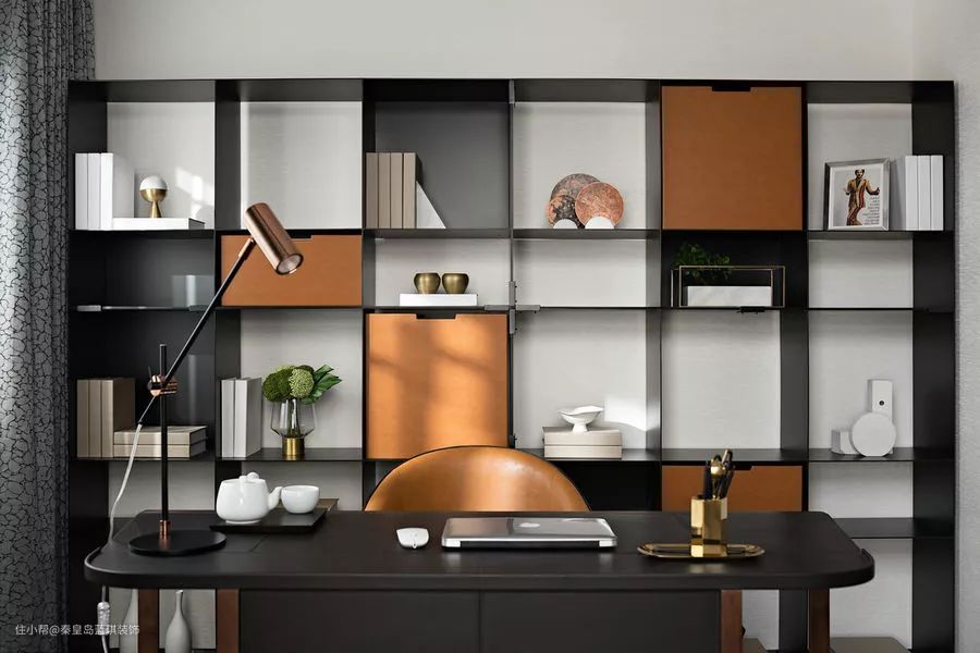 书架以虚实结合的体块感呈现,疏密不一,相异的色调在横纵间碰撞交错,演绎灵动随性之美,让收纳和展示一举两得,同时丰富了空间机能。踱入书房,这一隅是阅读、办公更好的场所。