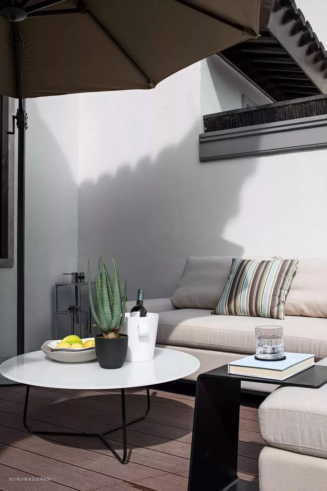 露台即世界,心中有田园。书房与粉墙黛瓦下,凉风拂面,调和一股闲适悠然的度假氛围。