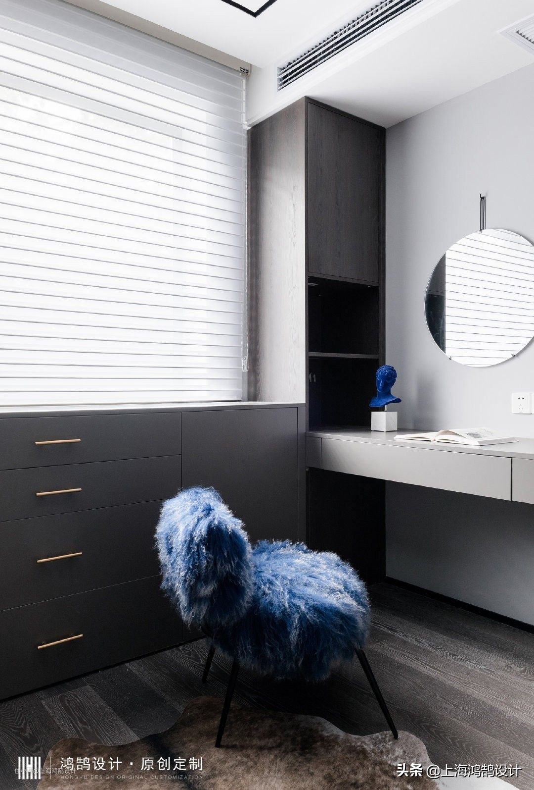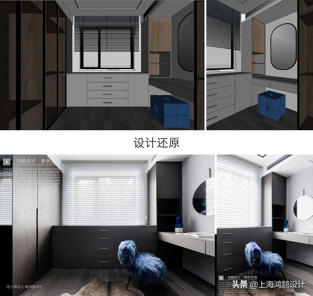 女业主没有结婚,父母平时不住,自己拥有大量的衣物、首饰、化妆品需要存放。客房由于尺寸受限,我们把主功能定义为衣帽间,次功能为临时的卧室,使用翻床来实现。窗下满做抽屉柜,代替传统斗柜使用,增加了收纳空间。