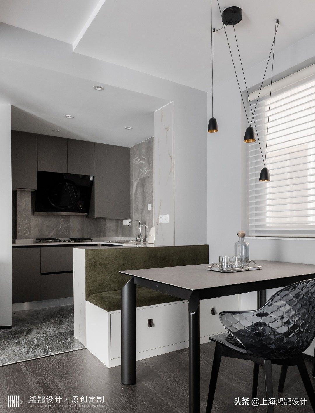 餐厅的整体面积缩小,全部推到边上,卡座设计增加舒适度与收纳空间, 链接着厨房的吧台,让两个空间有一个功能延续。