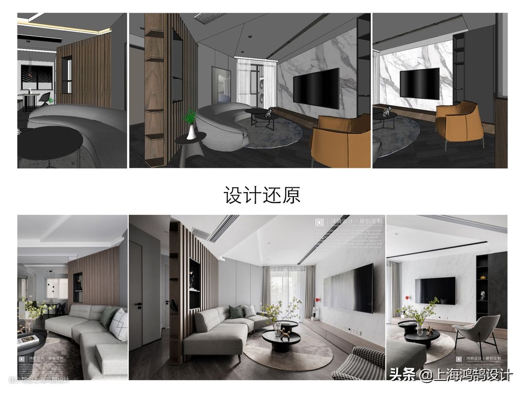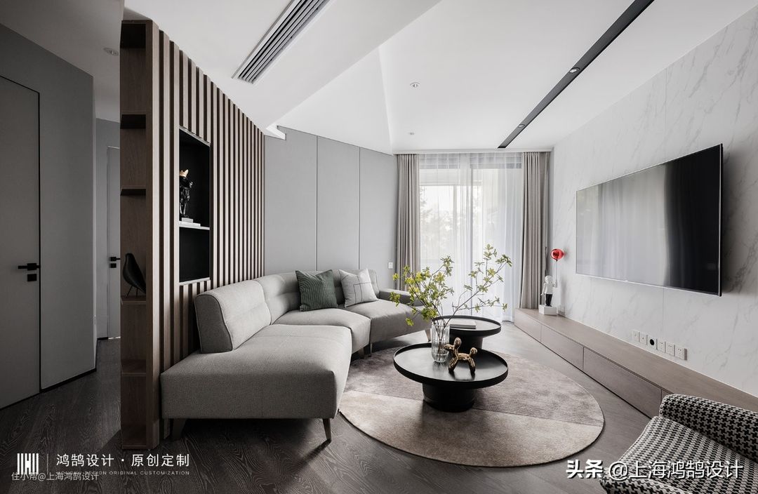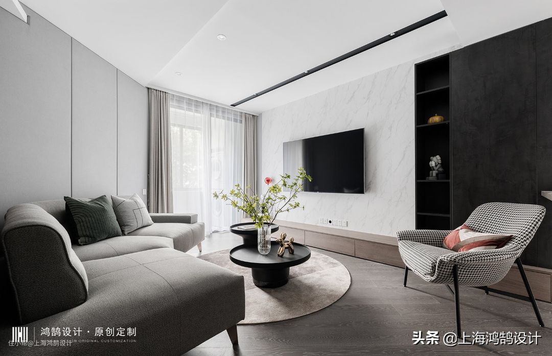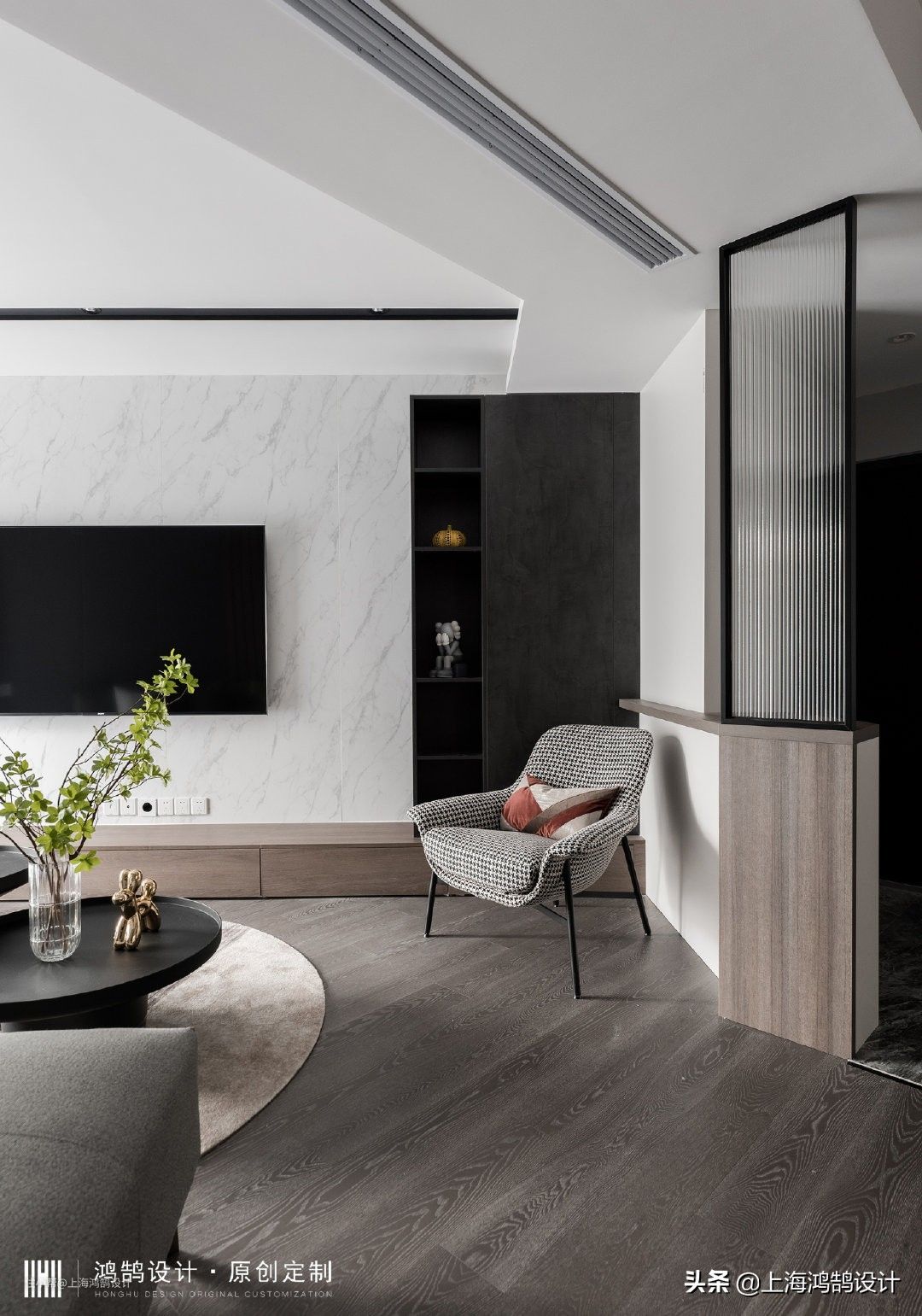 由于阳台开间窄,客厅实际采光面非常小,优点在与朝向正南,进光量没有收到阻碍。业主非常喜欢暗调,在地板选择上使用相对较深的木色斜铺。考虑室内整体色调问题,客厅电视背景墙没有做整面深色的柜子,而是用白色大理石纹路木饰面代替,增加明度。电视背景墙功能性地台被优先考虑,替代传统电视柜,具有丰富的收纳空间。
