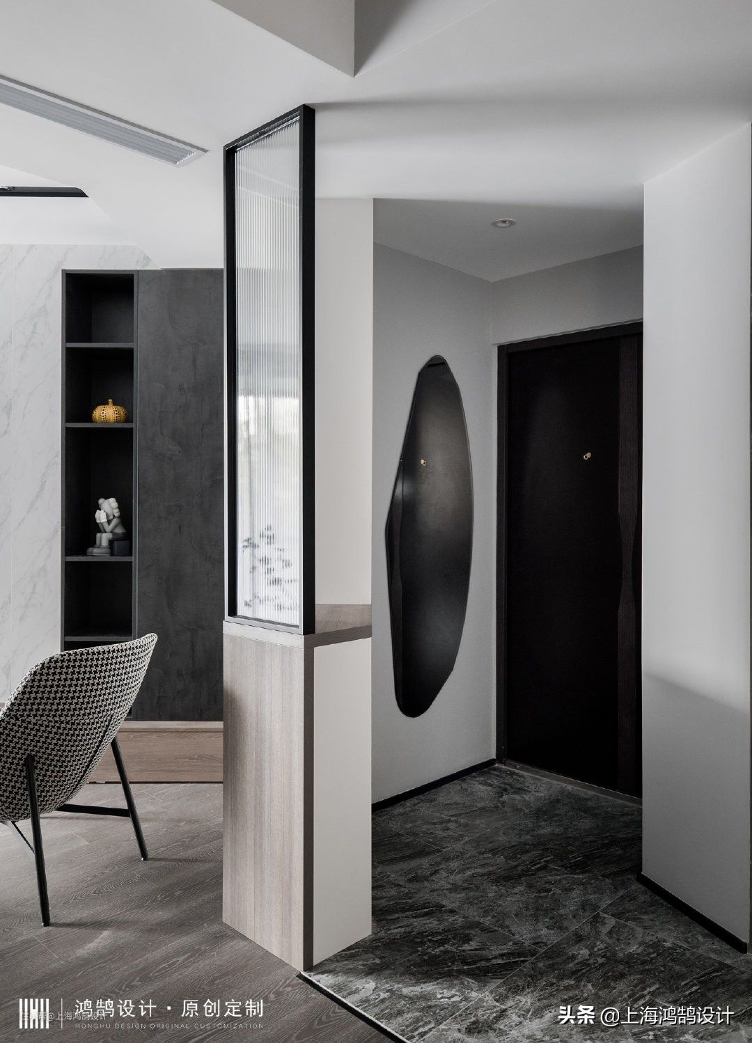 进门玄关做了折角半墙,为了保证门厅采光并没有做实,用一块长虹玻璃隔断延伸至顶,与客厅有一个遮挡关系,也避免了入户门正对房门的尴尬情况。同时折角的设计巧妙地与改造后的客厅沙发背景墙达到了平行关系,让空间关系协调一致。不规则造型穿衣镜弥补了墙面的空缺,功能性与艺术感都得到了兼顾。