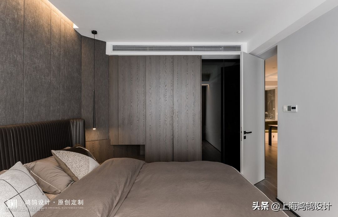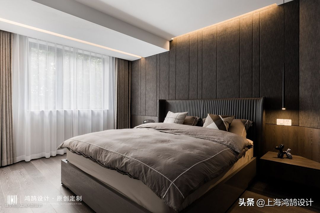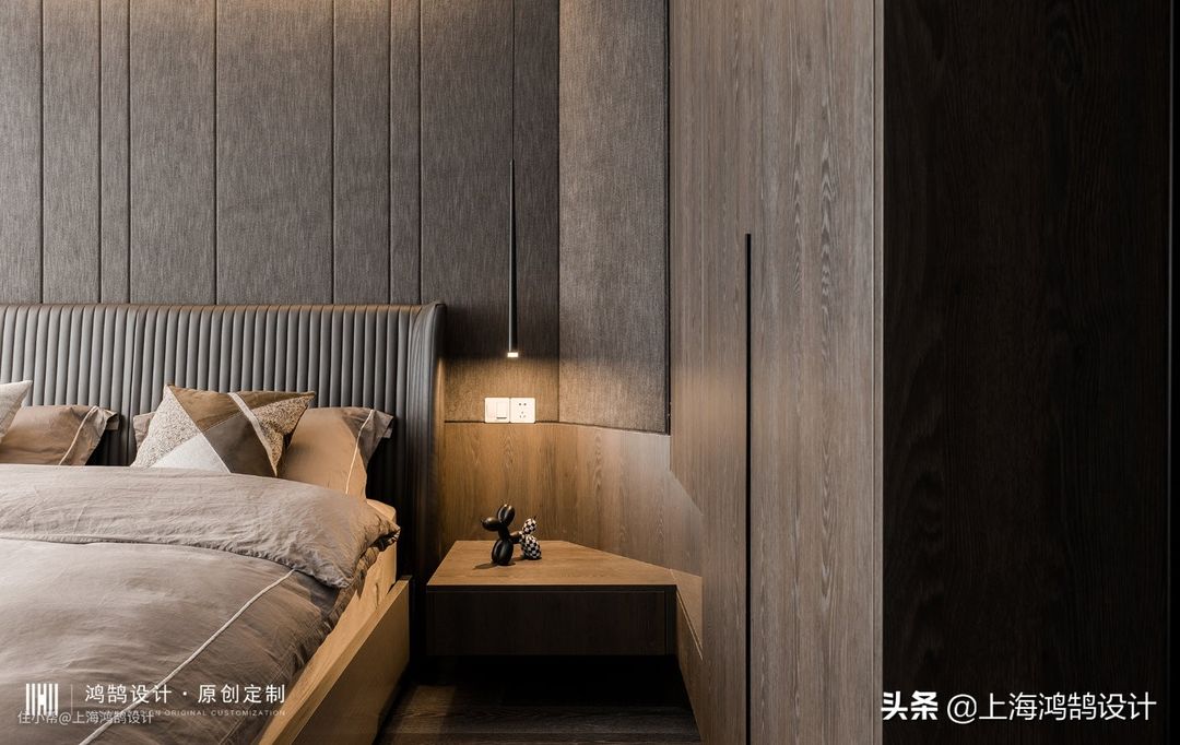 主卧室温暖、舒适、柔软,满足女主人的喜好,以深咖色基调为主。背景墙面做了一些简单的造型,线条切割硬包+深色木饰面材质拼接组合,加上暖光源辅助照明,突出整体质感。