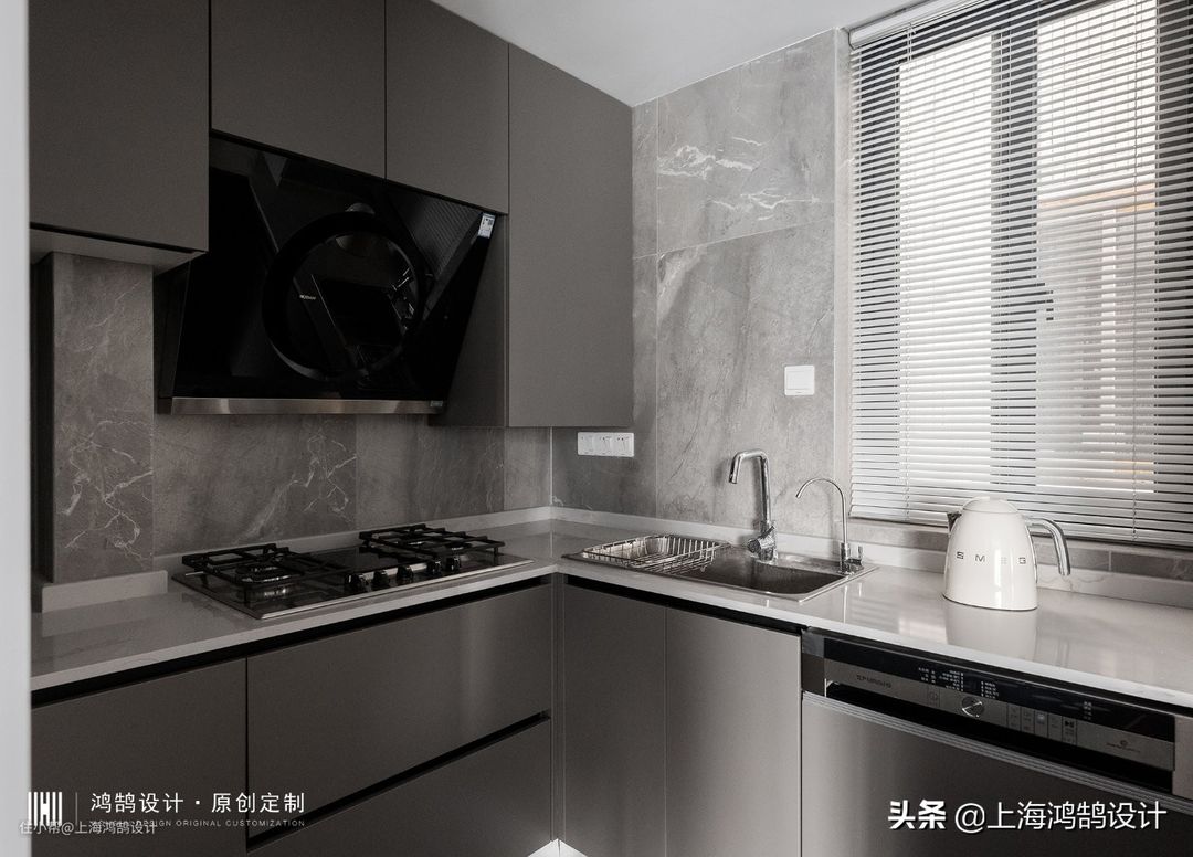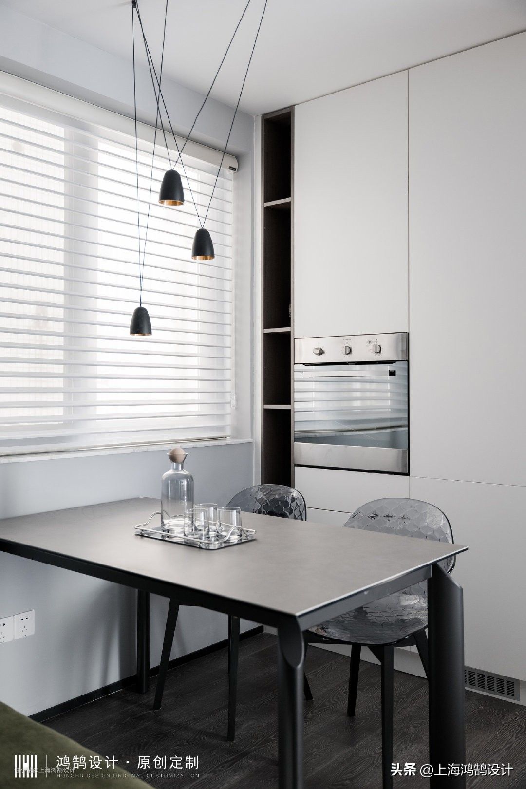由于厨房面积过小,我们把集成电器柜(烤箱+冰箱)与餐厅边柜一体化。通过合理布局光源与分区,餐厨空间以餐边柜、餐桌椅、卡座、吧台、厨房为顺序沿过道布局。